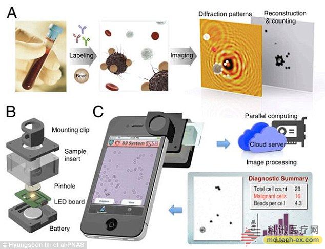 当将组织和血样加入设备后,这些微珠可以与样本中的癌细胞结合,同时引起光线通过设备的方式。利用手机app,这些图像被传送到计算机分析中心,然后将结果在45分钟内传送回手机。 研发设备的马萨诸塞州总医院和哈佛医学院的科学家说设备最快可在两分钟返回结果。