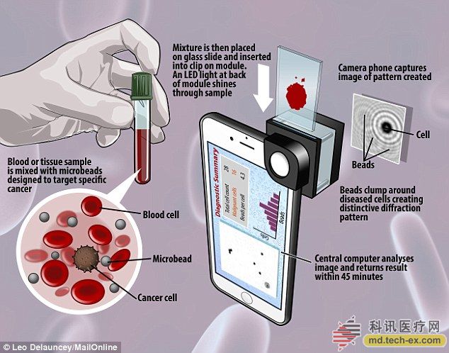 iPhone摄像头将能在几分钟内检测出是否患癌挽救人们的生命。科学家研发出设备可以卡在智能手机上最终将能在家使用。 他们的设备可使用大部分智能手机强大的摄像头组合能结合癌细胞结合的微珠诊断癌症。