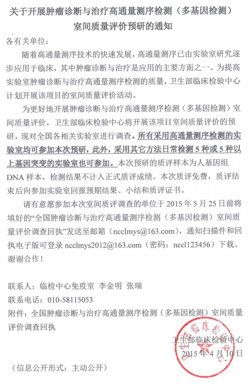 继2014年12月15日卫生部临床检验中心发布发布全国产前筛查与诊断实验室室间质评通知以后,2015年4月10日,卫生部临检中心发布《关于开展肿瘤诊断与治疗高通量测序检测(多基因检测)室间质量评价预研的通知》,表示将开展该项目室间质量评价的预研,对全国各相关实验室进行调查。