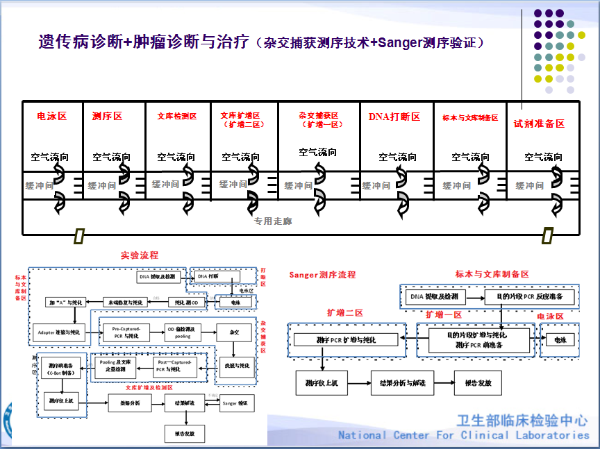 遗传病+肿瘤诊断与治疗实验室分区要求及示例 4. 试点实验室如使用商品化试剂,则应当使用经过国家食品药品监督管理总局(CFDA)批准的试剂,临床应用前应经过性能验证;如使用自配试剂(LDT),必须建立自配试剂的标准操作程序,并经过性能评价。以上均须保存相应的实验记录。 5. 试点实验室应对相应的检测仪器设备进行日常的维护和定期校准,并保存仪器维护校准记录。 6. 试点实验室应对技术人员制定培训计划,进行相关的在岗持续培训,保存人员培训记录。 7. 试点实验室应建立日常检测的实验记录方式,并保存相应记录。 8,试点实验室应建立规范的检测结果报告与解释模式。 9. 试点实验室 应建立室内质量控制程序,在日常检测中开展室内质量控制,保存室内质控及其失控及定期综合分析的记录,并有质量改进措施。 10. 试点实验室应参加由国家卫生计生委组织的相应项目的室间质量评价或进行有效的实验室室间比对,并保存室间质量评价或实验室室间比对记录,对不合格的结果应进行原因分析,并采取质量改进措施。 11. 试点实验室应制定包括以下内容的标准操作程序(SOP)及相关记录表格: (1)样本的采集、运送、保存、接收、登记和处理; (2)知情同意告知; (3)检测方法和步骤; (4)试剂和耗材的选择和保存(如为自配试剂,需详细写明试 剂的制备过程以及各原料的来源); (5)试剂性能验证或自配试剂的性能评价和方法确认; (6)仪器的使用、维护和校准; (7)人员培训; (8)结果报告与解释; (9)实验室数据、相关文件记录与保存; (10)室内质量控制; (11)室间质量评价或实验室间比对; (12)知情同意和保密程序。 12. 其他未尽的事项要求,试点实验室均应参照《医疗机构临床基因扩增检验实验室管理办法》。