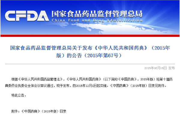昨日(6月10日),国家药典委员会发布公告,称根据《中华人民共和国药品管理法》,《中华人民共和国药典》(2015年版,以下简称药典)经第十届药典委员会执委会全体会议审议通过,予以发布,自2015年12月1日起实施。