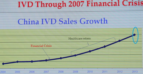 在2008年,中国的IVD销售额的增速非常缓慢,经历了金融危机和医疗改革,中国IVD产业销售额的增速显著上升。根据Frost & Sullivan等咨询公司的市场调研报告,2011年国内体外诊断市场规模超140 亿元,2012年市场约167亿元,2013年近200亿元,2014年达260亿元。 中国IVD市场不断扩大的原因