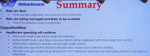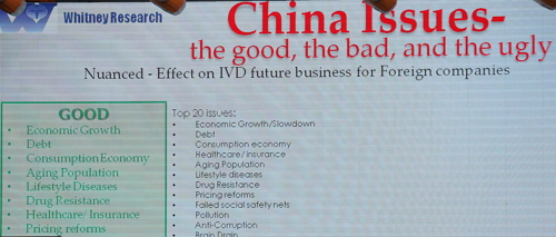 Nat Whitney将影响中国IVD产业的因素分为“有利的”、“不利的”、“晦涩的”。其中促进中国IVD产业增加的有利因素包括以下几点: 1、中国医疗改革的推进,使得3项医保覆盖率超95%,导至医疗需求释放,同时慢性病/传染病发病率居高不下,带来诊疗人次5%-8%稳定增长; 2、老龄人口比重提升,城镇化比例提升,人均诊疗费用上升; 3、群众疾病预防意识增强,体检意识增强; 4、诊断新技术、新产品替代低端产品,高端产品比重提升; 5、定价指引政策,按检验项目/检测方法收费,国产诊断试剂开始替代进口; 6、在取消药品加成,打击药品商业贿赂、药品招标降价的大环境下,医院临床检验收入占比提升。