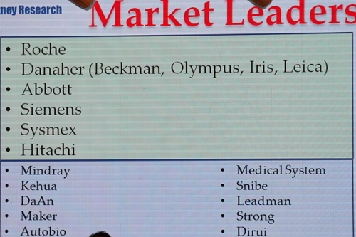 在中国的体外诊断公司中,他以达安基因作为实例,分析了达安基因在2014年的增速情况和销售额占比,其7.25亿的体外诊断收入中,诊断服务占比32%,试剂占43%,仪器占24%。并表示,尽管国际竞争形势非常严峻,但中国体外诊断市场仍在快速发展,预计将在未来的10~15年内超过美国,成为世界上最大的体外诊断市场。 全球体外诊断呈现的趋势及体外诊断公司领导者 1、免疫诊断(主要为化学发光免疫诊断)取代生化诊断成为市场主流; 2、体外诊断向两个方向发展:高效率、自动化的一体化诊断;POCT检测; 3、个体化临床诊断越发受到重视。