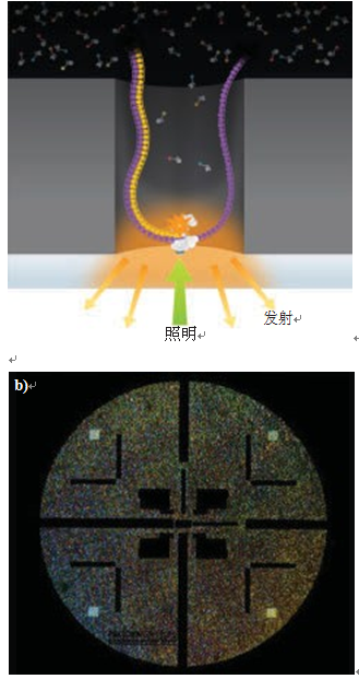 图2. Pacific Biosciences RS II测序仪。每个零模式波导(ZMW)含一个单一聚合酶(图a)。通过将激光分离指向各个ZMW的众多衍射极限光斑,可在一个SMRT芯片上同时实时模拟和监测多达150,000个ZMW(图b)。(图片由Pacific Biosciences公司提供)