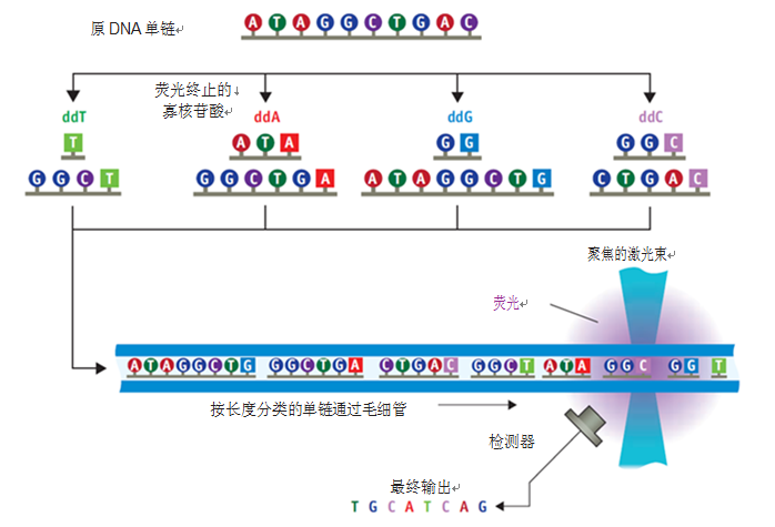 该方法通过第一代仪器实现了自动化,其原理为改用荧光标记的链终止核苷酸(用四种不同的荧光标记四种碱基),通过毛细管电泳法(CE)区分各复制片段的长度,随后用激光荧光(通常为488 nm)识别A、C、G、T(参见图1)。