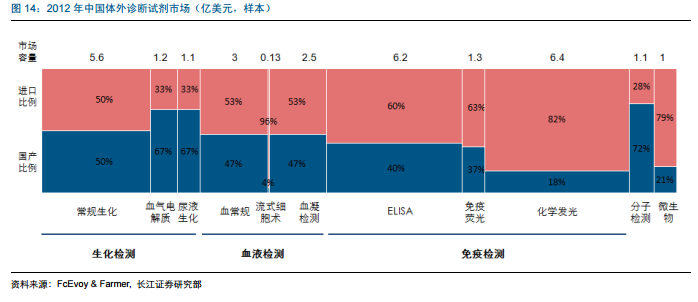 既然在试剂上面的国产化无法避免被国外企业卡住生产原料的话,在仪器上面的情况又是如何的呢?2012年,国产生化检测仪器市场占有率已经超过了进口仪器。免疫诊断的仪器还处在国产替代进口的过程中,但是势头很猛,仅2012年免疫诊断中相对高端的化学发光仪器的市场占有率也达到了54%。
