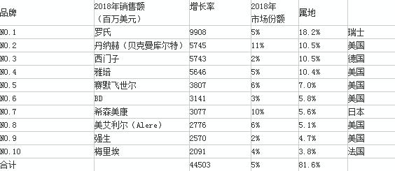数据统计显示:到2018年,这十家巨头企业年总销售额将达到445亿美元,平均增长率为5%。销售总额合计占到整个市场份额的81.6%,占比相比2011年统计数据上升了4个百分点。