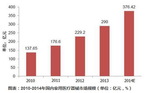 图表:2010-2014年全球家用医疗器械市场规模(单位:亿美元,%) 国内迎来蓬勃发展期,消费+需求驱动370+亿元市场规模
