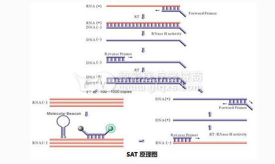 带有T7启动子的引物与靶标RNA结合,开始逆转录合成cDNA;在M-MLV RT酶的RNase H活性作用下靶标RNA链降解,形成单链cDNA;之后反向引物与cDNA结合,在M-MLV RT酶的聚合酶活性作用下产生靶标核酸(RNA)的一个双链DNA拷贝,且该双链带有T7启动子。在T7 RNA聚合酶的作用下,一条DNA双链上产生多个(100~1000个)RNA拷贝;每一个RNA拷贝再从反转录开始进入下一个扩增循环;同时,带有荧光标记的探针和这些RNA拷贝特异结合,产生荧光。该荧光信号可由荧光检测仪器实时捕获,直观反映扩增循环情况,整个扩增过程都在同一温度(42°C)下进行。 下表列出了SAT同目前常见的其他几种核酸扩增检测技术在检测靶标、酶、反应条件、扩增产物及仪器设备等方面的比较: SAT与各种核酸扩增检测技术对比表