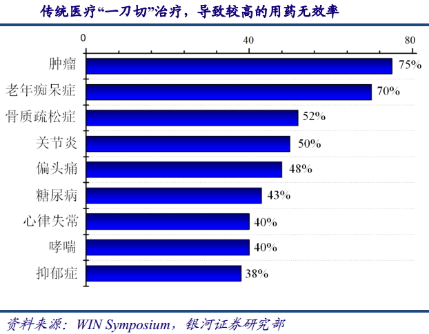 传统医学痛点催生精准医疗需求。传统的循证医学是结合临床医生的个人实践经验和客观的科学研究证据,对于症状相同的病人使用相同剂量的同种药物进行治疗,但治疗效果却千差万别。传统治疗方案显示,肿瘤的无效率高达 75%,糖尿病无效率 43%,抑郁症无效率也有 38%。人们逐渐意识到大多数疾病的发生是自身遗传密码和外界环境共同作用的结果。 精准医疗借助可监测的遗传信息和环境信息,针对个体提供定制的优化治疗方案,提升现有治疗水平,并尽量在发病前就有望有效预防。