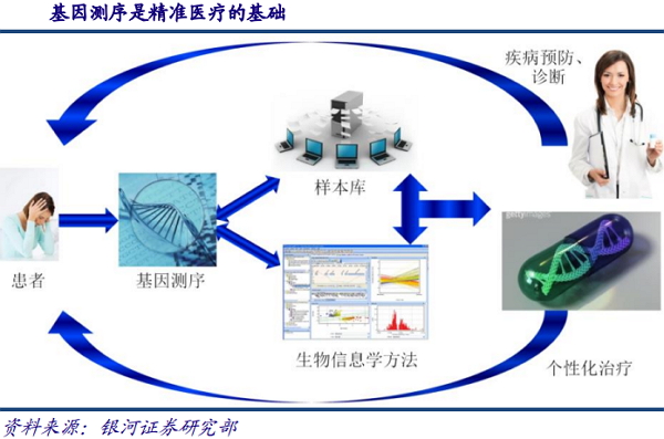 近日,银河证券历时两个多月,对基因测序行业龙头企业华大基因、贝瑞和康和达安基因相关上市公司进行了全方位调研,对行业政策环境,技术趋势及行业巨头的商业模式和投资逻辑进行了深入全面的分析,深入研究基因测序全产业链,梳理了 23andMe、Illumina、罗氏和谷歌的商业模式变革,并发布了《基因测序的发展趋势与商业模式——探讨精准医疗系列报告之(一)》的深度调研报告。研报指出,短期关注获取基因组样本和临床数据能力强的公司,长期内关注发展三四代测序技术的公司。 基因测序是精准医疗的基础,具广阔应用和增长空间 随着人类基因组测序技术的飞速提升、生物医学分析技术的快速发展和大数据分析工具的日益完善,我们正进入全新的医疗健康时代——精准医疗。 精准医疗是一种基于“个人”的定制医疗模式,其以个体的组学信息和遗传信息为基础,以环境、生活方式、既往病史及诊疗方式等为跟踪对象,搜集全方位、可量化、有前瞻性和时效性的个体数据,通过数据的综合分析、挖掘形成有价值的医学信息,最终设计出针对个体的最优解决方案。基因测序为个体提供连续基因大数据,是精准医疗的基础和重要实现途径,制药、器械、IT 等行业巨头纷纷布局该领域。 基因测序技术凭借灵敏度高、精度和通量高、价格低廉等优势,成为基因检测技术中获取人体基因组数据的主流技术,通过将基因组数据与无线生物传感器获取的生命体征信息(如血压、心跳、脑电波、体温等),成像设备中的个体信息(如 CT、MRI、超声等)以及传统医学数据相结合,精准医疗为个体提供全新的定制医疗。 (一)“一刀切”治疗时代已过时,启动精准医疗刻不容缓
