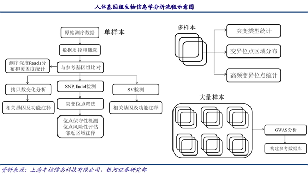特别推荐:银河证券与市场不同的观点 银河证券认为基因测序产品发展的长期瓶颈是测序技术水平。NGS 测序读长过短,直接影响对基因组数据的解读能力,包括生物信息学分析技术和遗传咨询。人体基因组包含超过 60 亿个碱基,通过 NGS 测序得到的基因组,只能对其中单个碱基的突变(SNP)或 20bp 以下的碱基突变(Indel)进行分析,仅有 3%序列能从临床给予解释。然而分析基因组序列的结构变异和拷贝数变异将是攻克复杂疾病的突破口。 银河证券认为基因测序产品发展的短期瓶颈是获取高质量基因组数据和临床表型数据的能力。目前公司对于基因组数据的遗传解读大部分通过文献调研,但该方法对不同地区的不同人种并不适用。为通过基因组准确解读患病情况,统计学方法和数学建模必不可少。高质量的基因组样本作为自变量、临床表型数据作为因变量,对模型参数的训练有着举足轻重的作用。 投资策略:短期内关注获取基因组样本和临床表型数据能力强的公司,长期关注发展三四代测序技术的公司。 银河证券对国外公司商业模式和投资策略进行梳理,发现主要有两个布局方向: (1)累积基因组样本,如 23andMe 和 Google 均通过累积基因组样本量分羹市场; (2)发展超长读长的新型测序技术:如罗氏则放弃二代测序市场,重点布局三四代测序和肿瘤领域。我们认为只有通过累积足够数量的“专病”基因组样本和发展三四代测序技术,才能将疾病的基因型与表型完美关联,最终实现对疾病的有效预防、精确诊断和个性化治疗。 投资时应注意风险因素:短期内基因测序产品难以获得飞跃式发展,大部分处于消费级和科研级应用阶段。 |