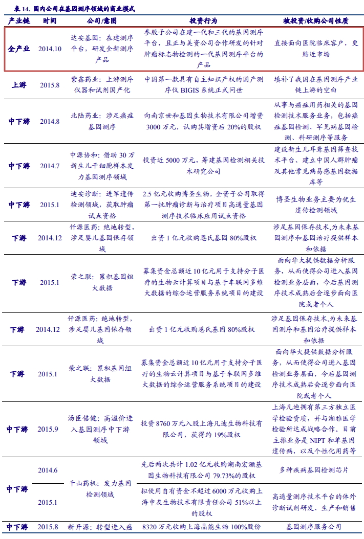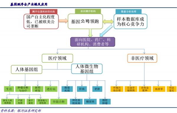 医疗领域可分为人体基因组和人体微生物基因组两个子领域。针对人体基因组的主要产品有肿瘤学(诊断筛查与治疗、靶向用药、伴随诊断等)、生育(无创产前诊断、胚胎植入前检测、新生儿遗传病排查、亲子鉴定等)、遗传学疾病和新药研发指导等。目前人体微生物基因组与宿主健康的关系也已被重视,如 2007 年和 2008 年,美国国立卫生研究院(NIH)和欧盟先后启动了人体微生物组计划(HMP)和人体肠道宏基因组计划(MetaHIT),可通过分析人体微生物基因组检测宿主的肠道疾病、神经系统疾病、肝病、糖尿病、肥胖以及腹腔肿瘤等。 在非医疗领域中,可以通过环境微生物基因组研究治理环境污染的新方法、探测石油存储和地质学研究,也可以用于农牧业配种和司法鉴定等。本篇报告主要讨论基因测序在医疗领域中针对人体基因组的应用。 (一)欧美公司垄断测序仪器与耗材市场 1、二代测序是目前主流测序技术,Illumina 占最大市场份额 测序技术是测序仪器的核心所在,迄今为止已历经四代发展。其中主要的是前三代测序技术: 第一代测序技术,即 Sanger 测序技术;第二代测序技术是当今主流技术,主要有 Illumina公司的 Solexa 和 HiSeq 技术, Life Tech 公司的 Solid 技术和 Roche 的 454 技术;第三代 Pacific Biosciences 公司的 SMRT 测序技术。第四代测序技术正向着测序仪器体积更小的方向发展,如 Oxford Nanopore Technologies 公司的 MinIon 纳米孔单分子测序技术。 主要公司有 Illumina, Life Tech (被 Thermo Scientific 以 136 亿美元收购)和 Roche。其中 Illumina凭借其超高通量和相对较长读长的优势,占有超过 70%的市场份额。 2、三四代测序技术 10 年内凭借超长序列读长取代二代测序技术 我们预计 10 年后二代测序技术会被三、四代测序技术所取代。各代测序均有不足之处,一代测序的主要缺陷是低通量和高成本,二代的缺陷是序列长度较短,三四代测序在准确率方面有严重缺陷。由于 NGS 技术面临的短序列缺陷可以通过生物信息学工具在一定程度上进行弥补,因此二代测序技术是现今最稳定,应用范围最广泛的测序技术。但目前科学家正在通过减缓 DNA 序列通过纳米孔速度的方式提高第三代测序的准确度,相关成果已发表在《Nature》子刊。我们预计 10 年内三、四代测序的准确度将会显著提升,届时将在保证测序通量的基础上,凭借着超长序列读长的优势取代二代测序。 基因测序全产业链划分为上游的测序仪器与试剂耗材市场,中游的基因测序服务市场和下游的生物信息学分析市场。中下游市场面向群体包括医院、药厂、科研机构以及消费者等,可分为医疗和非医疗两个领域。 (二)基因测序服务市场百家争鸣,积极向上下游延伸 目前全球有上千家厂商提供测序服务,中国有超过 200 家。美国拥有全世界最多得测序仪,中国测序仪数量不超过 500 台。随着市场对测序的需求不断提升,中游市场提供测序服务的对象包括医院、疾控中心、科研机构等,提供包括用于无创产前诊断、肿瘤诊断与治疗、遗传学诊断以及辅助生殖等相关的基因测序服务。 我国测序服务提供商积极地向产业链上游延伸。国内在测序仪器市场的开发策略分为两类: (1)第一类是通过与国外仪器生产商合作,买断产品在国内的全部权利。如贝瑞和康与Illumina 合作生产的新型测序仪、华大基因收购美国基因测序仪公司 Complete Genomics 后基于该平台开发 BGISEQ1000 测序仪、达安基因与 Life Tech 合作的 DA8600 测序仪。这种模式虽然使用国外的仪器技术,但通过国内的仪器设备通道申报 CFDA,申报和审批相对较快。 (2)第二类是自主研发模式,如紫鑫药业与中科院基因组所合作的自主研发的二代测序仪器已于2014 年 4 月 18 日发布,数据产出量与 Roche 454 相当。 中下游市场结合非常紧密,测序服务公司往往会提供有偿的生物信息学分析服务。美国大型的测序服务公司有:Sequenom, CardioDx 和 Foundation Medicine 等,国内的主流测序服务公司有华大基因、诺禾致源、贝瑞和康、达安基因以及北陆药业等。不同公司根据提供服务的内容有所区分。 二代测序技术凭借通量大、精度高、价格相对低廉等优势,已成为目前主流测序技术。 由于专利保护力度大和技术门槛高,二代测序仪器制造市场壁垒较高,已被欧美公司垄断。 (三)下游数据解读能力需进一步发展 人体基因组共有 23 对染色体,包含超过 30 亿个碱基,而目前仅有 3%能从临床给予解释。由测序服务公司提供的原始序列文件在经过系统地分析处理前,无法提供任何有效的信息。 数据有效分析的三要素包括高性能计算平台、专业的分析软件和高质量的大样本数据库。计算平台用于对测序仪器得出的原始序列文件进行质量剔除、序列匹配等一系列分析的基础工作,分析软件和大样本数据库用于遗传解读和咨询。据 Ebiotrade 调查,69%的被调查人员认为数据的分析解读是影响测序产业链发展最大的瓶颈。 数据分析的有效性将决定下游市场公司的核心竞争力。目前全球有超过 100 家生物信息公司提供基因数据分析服务,成熟的高通量测序技术产生了海量数据,生物信息学分析市场涵盖数据压缩存储、工作平台、数据分析软件等。现阶段生物信息学技术可以对基因组学数据进行初级分析,主要集中在分析人体基因组的 SNP 和 Indel 检测,而分析 SV 和 CNV 则受限于样本量较少和 NGS 测序技术的局限性,无法使