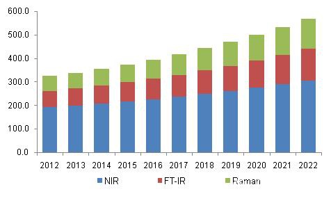 Grand View Research最新的研究报告显示,2014年全球过程光谱市场为7.54亿美元,预计2022年该市场将达到12.7亿美元,预测期内复合年增长率超过6.5%。 报告中主要对近红外(NIR)、拉曼和傅里叶变换红外(FT-IR)进行了分析研究。其中,2014年近红外光谱在食品和农业产品领域得到广泛使用,特别是医药和有机产品中的水分、脂肪含量以及营养成分的检测,其市场份额占过程光谱整体收入的55%以上。 2014年,拉曼光谱市场价值超过1.3亿美元,显示高潜力的增长,预计预测期内复合年增长率将增长超过8.5%的。这种技术的主要应用在制药行业,医药产品的任何变化会导至其性能的变化,可能对消费者产生不利影响。拉曼光谱两大类型,台式和便携式,主要在质量检查和产品开发过程中用于盐形态和多晶型物的分析。