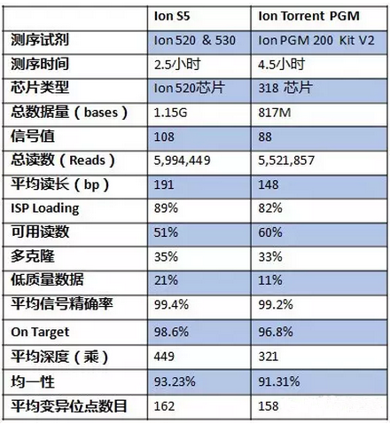 北美时间9月1日,赛默飞发布了两款最新的NGS系统Ion S5 和Ion S5XL,旨在提供更加简捷的靶向测序流程。10月29日Ion S5测序仪的首批实验数据产生于阜外医院。阜外医院研究人员选用了主动脉基因疾病组合测序,该基因组合包括15个与主动脉疾病相关的致病疾病,研究人员通过文库构建——模板制备——上机测序三个大步骤最后得出了Ion S5的首批数据。 Ion S5以5“S”为主要特性:Simple-最简捷的靶向测序流程,Scalability- 灵活的通量选择,Speed-最快的测序速度,Small Sample Input-微量样本输入,Streamlined Data Analysis-流畅的数据分析流程。那么Ion S5真实实验数据如何,研究人员将此批数据与Ion Torrent PGM数据做了比对,结果如下表所示: