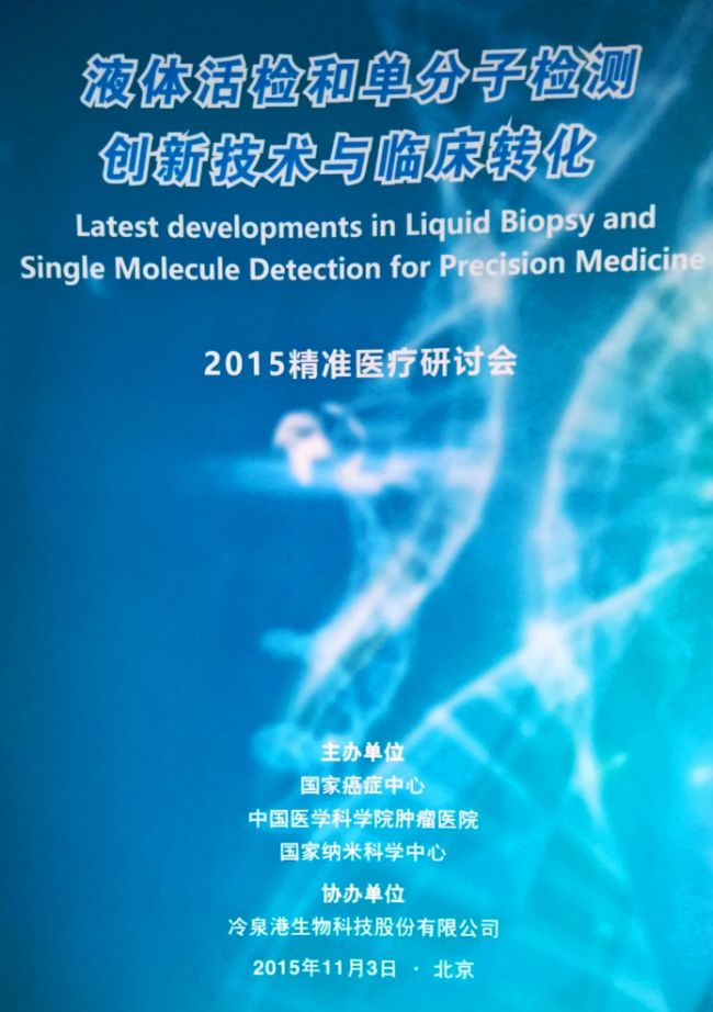 2015年11月3日和5日,以“液体活检和单分子检测创新技术与临床转化”为主题的2015精准医疗研讨会在北京和上海成功举行,会议由国家癌症中心、中国医学科学院肿瘤医院、国家纳米科学中心共同主办,冷泉港生物科技股份有限公司协办。这是国内第一次聚焦液体活检和单分子检测的专业研讨会,来自科研、临床、产业界的200多位参会者进行了学术交流。 会议围绕“精准医疗”话题进行了深入探讨。分享了精准医疗领域中关于液体活检的最新的技术动向和研究成果,从技术端、应用端与临床转化等不同角度交叉探讨,为业内专家搭建了一个交流互动的平台。 2015可谓精准医疗元年,随着基因检测技术的快速发展, 精准医疗对于传统医疗模式的革 命和创新得以成为现实。MIT Technology Review杂志发布了2015年度十大突破技术(Breakthrough Technologies 2015)榜单,液体活检光荣上榜。世界各地的实验室竞相开发基于简单血液 检测的检测技术,其中循环肿瘤细胞(Circulating Tumor Cell)与ctDNA(Circulating Tumor DNA)是最受瞩目的生物标志物,粗估液体活检的市场规模至少达400亿美元。然而,DNA是以单分子的形式存在于每个细胞中,基因表达和基因組的变化是随机发生的,这也使 得在单细胞和单分子水平上的检测成为必须。生物大分子以纳米尺度存在,单分子检测就离 不开纳米科学。纳米医学是纳米科学研究的重要新兴领域,是世界各国优先发展的与人类健 康密切相关的交叉学科研究前沿领域,充满了科学创新的机遇与挑战。2013年,《NATURE》杂志专门对CTC纳米检测进行了综述,将其列为最具创新性和转化 潜力的肿瘤诊断新方法。基于纳米孔的第三代测序技术是万众瞩目的具有颠覆性的单分子测 序技术,兼备快速高效和价格低廉的优势,可以克服目前NGS技术在ctDNA检测上难以跨 越的障碍。因此如何利用现今最前沿的技术,研究这一可能改变未来疾病检测与治疗的诊断方法,便是此次会议的重点。
