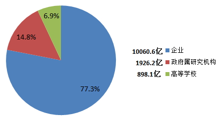 各类企业经费支出为10060.6亿元,比上年增长10.9%;政府属研究机构经费支出1926.2亿元,增长8.1%;高等学校经费支出898.1亿元,增长4.8%。企业、政府属研究机构、高等学校经费支出所占比重分别为77.3%、14.8%和6.9%。