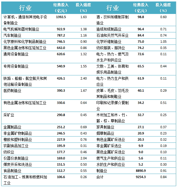 研究与试验发展(R&D)经费投入超过500亿元的行业大类有7个,包括这7个行业的经费占全部规模以上工业企业研究与试验发展的比重为61.1%。其中,医药制造业经费投入为390.3亿元,排在第9位。(详情见下表)