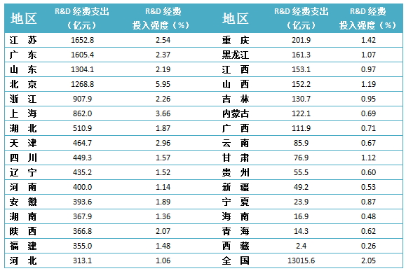 研究与试验发展(R&D)经费支出超500亿元的7个省(市)为江苏(1652.8亿,占12.7%)、广东(1605.4亿,占12.3%)、山东(1304.1亿,占10%)、北京(1268.8亿,占9.7%)、浙江(907.9亿,占7%)、上海(862.0亿,占6.6%)以及湖北(510.9亿,3.9%)。(具体见下表)。