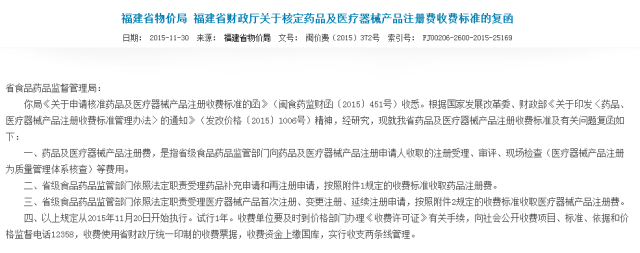 11月30日,福建物价局真的下发了《福建省Ⅱ类医械注册收费标准》的通知。以下是文件截图: