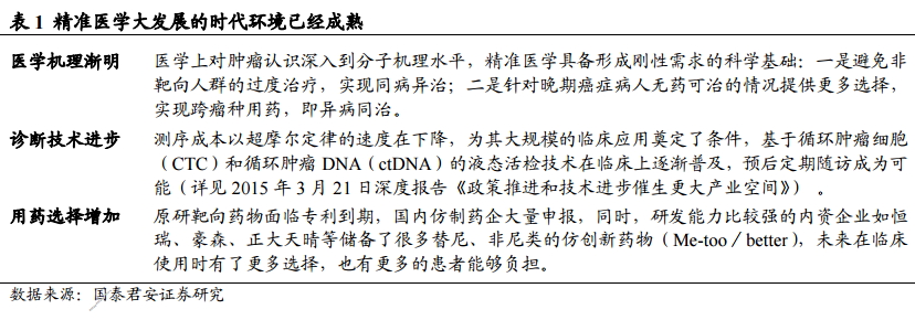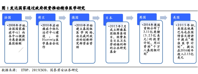 2015年12月1日,获得“第十三届新财富最佳分析师”医药生物行业榜单第二名的国泰君安分析师丁丹团队发布了《精准医学万事具备,只待政策东风来袭》调研报告,再次给予医药行业“增持”评级。 其主要观点包括: 1. 接轨国际,顶层设计加速行业发展 央视新闻报道,根据国家卫生计生委消息,目前我国正在制定“精准医疗”战略规划,旨在实现精准的疾病分类和诊断,制定具有个性化的预防、治疗方案,这一规划或将被纳入到十三五重大科技专项。我们认为,我国精准医学大规模临床研究应用的各项基础已经具备,政策东风的到来或将成为推动产业发展的加速器。 国际上对精准医学的需求迫切性(尤其是肿瘤领域)已经达到了很高的认知程度,发达国家近年推动了多项政府投资的相关研究计划: 法国:2008 年开始法国国家癌症中心(INCa)向各中心拨款为患者提供基因检测,一旦出现新的靶向治疗药物,每个患者均有机会进行分子检测,入组临床研究; 荷兰:2010 年启动癌症个体化治疗中心建设,目前囊括 8 家研究中心和教学医院,旨在为患者提供更有效的肿瘤治疗方法,增加可供患者使用的药物,由 Hartwig 医学基金会运作; 德国:2010 年开始建立基因组医学网络,由北威州政府的创新研究部资金资助,通过二代测序技术分析患者基因组类型,评估个体化治疗的效果和费用; 日本:2013 年 2 月成立肺癌基因组筛查项目(LC-SCRUM-Japan),通过筛查罕见基因变异为晚期肺癌患者定制治疗方案,目前涉及 160 家以上研究机构,经费来自日本卫生劳动福利部的公共研究基金; 英国:2014 年英国公布了 3.11 亿英镑(5.23 亿美元)的投资计划,用以资助“十万人基因组计划”,其目标是根据基因组学和临床数据制定个性化的癌症和罕见疾病疗法; 美国:2015 年初,美国总统奥巴马也在国情咨文演讲中提出“精准医学计划”,提议在 2016 财年投入 2.15 亿美元,推动个性化医疗,国国家癌症研究所(National Cancer Institute,NCI)的 NCI-MATCH(Molecular Analysis for Therapy Choice)项目作为史上最大、最精密的肿瘤临床试验已经展开; 此外,欧洲 肺 癌 研 究 平 台 (ETOP)发 起 过 两 个 国 际 间 合 作 项 目Lungscape(2011 年)和 SPECTAlung(2014 年)。