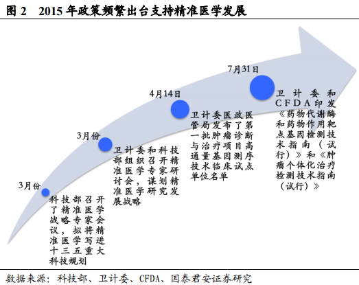 我国作为临床资源最为丰富的国家,庞大的病例样本量具有开展精准医学研究的先天优势。2015 年以来,监管层面种种支持举措相继出台,表明精准医学到发展已上升到国家意志。 3月份科技部召开了精准医学战略专家会议,拟将精准医学写进十三五重大科技规划;随后卫计委和科技部组织召开精准医学专家研讨会,谋划精准医学研究发展战略;4 月14 日卫计委医政医管局发布了第一批肿瘤诊断与治疗项目高通量基因测序技术临床试点单位名单;7 月 31 日卫计委和 CFDA 印发《药物代谢酶和药物作用靶点基因检测技术指南(试行)》和《肿瘤个体化治疗检测技术指南(试行)》 (详见 2015 年 8 月 2 日报告《官方技术指南颁布,个体化用药加速发展》)。