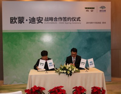 据了解,欧蒙是一家生产多种医学实验诊断试剂的跨国公司,主要致力于抗体的血清学检测,为自身免疫性疾病、感染性疾病和变态反应性疾病的诊断提供准确的血清学诊断指标;同时在自动化仪器、实验室管理软件系统以及基因芯片等领域也拥有备受信赖的优秀产品和服务。欧蒙通过应用自主创新并获得专利的生产方法和微量分析技术,已让其成为全球医学实验诊断领域的领先制造商。