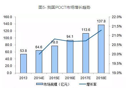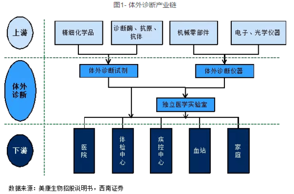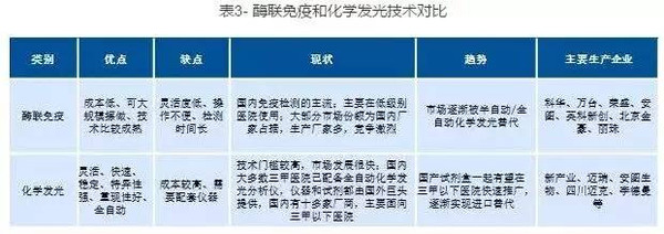 我国IVD行业规模小,国产化率低,但增速快,面临众多投资机会,从其细分子行业来看: 化学发光将逐步替代酶联免疫和实现进口替代的巨大机遇; 分子诊断随着二代测序技术普及带来的广阔市场; POCT 向定量化、无创化和小型化发展的技术趋势,并借助互联网向家庭慢病监测和管理的新模式延伸; 独立医学实验室规模效应有望催生行业巨头。 1. IVD产业链及细分行业介绍 体外诊断(In Vitro Diagnosis,IVD)是指将血液、体液、组织样本从人体中取出后进行检测而进行的诊断,目前临床上80%以上的疾病诊断都依靠IVD,被誉为医生的“眼睛”。行业年均增速达15%左右,是医疗领域最具活力和发展前景的子行业之一。 完整的IVD 产业包括上游原料供应行业和下游需求市场,上游原料包括生物与化学原材料以及各种机械零配件;下游需求主要来自医院、第三方独立医学实验室、体检中心、血站及家庭健康监测(见图1)。 IVD 细分领域众多(见表1),通过不同层次、不同维度的多个指标为医生提供决策支持信息。根据检测指标、标本、原理等的不同,IVD 可被划分为多个细分领域,相互交集较小,各个细分领域各具特色。IVD 大致上可分为在实验室进行的生化诊断、免疫诊断和分子诊断,床旁快检POCT 以及下游第三方独立医学实验室(IVD 检测服务)共五个较大的细分领域。 根据使用环境和操作者的不同,IVD 还可分为临床实验室诊断和即时诊断(Point of CareTest,POCT)(见表2)。与临床实验室诊断相比,POCT 具有三大特色:一是检测时间短;二是检测空间不受限制;三是检测操作简单,非专业人士也可操作。内外因素共同驱动了POCT 的快速发展:一方面,POCT 的简便性和快速性满足了“在最短的时间内得到准确检验结果”的临床要求,是IVD 技术发展必然趋势。 另一方面,传统检验往往导至医疗费用较高,而POCT不需要大型的专业设备,价格相对较低。小型化、傻瓜式的POCT 自动检测系统未来将会像手机等数码产品一样悄然渗透到生活的每一个角落,成为第一现场检测、第一时间检测、家庭健康管理的必需品。 2.生化诊断:试剂完成进口替代,仪器仍由外企主导 生化诊断起步最早且发展也最成熟,为医院最为常见的检查项目。由于生化试剂技术壁垒相对较低,且生化诊断系统多为开放系统(即试剂和仪器可以分别由不同厂商提供),目前生化试剂国产化率已超过80%,但高端的全自动生化分析仪仍由外企主导。生化诊断试剂国内主要企业有利德曼、深圳迈瑞、迈克生物、九强生物、中生北控等。全自动生化仪外资品牌主要有日立、贝克曼等,国产有迈瑞、科华生物、迪瑞医疗、美康生物等。 预计2015 年我国生化诊断市场规模将达到61 亿元,年均增长率约为6%-8%。同时由于生化诊断试剂竞争较为激烈且行业集中度低,未来性价比高和渠道能力强的厂商有望最终胜出,市场集中度将逐步提升。 生化诊断未来的增长动力主要来源于两方面:全自动生化分析仪的进口替代和生化诊断产品在基层医疗机构的覆盖率逐步提高;新检验项目的开拓,特别是一些免疫诊断可以通过透射免疫比浊方式在生化诊断仪器上实现,通过新业务带来市场增量。 3.免疫诊断:化学发光取代酶联免疫,试剂仪器一体为竞争核心 免疫诊断试剂品种繁多,仪器平台先后经历了放射免疫(RIA)、酶联免疫(ELISA)、时间分辨荧光免疫(TRFIA)以及化学发光免疫(CLIA)的技术革新。目前国际国内主流技术为酶联免疫和化学发光(见表3),由于化学发光技术优势明显,且自动化程度高,已形成取代酶联免疫的大趋势。 预计2015年我国免疫诊断市场将达到95 亿元,年均增长率不低于15%。其中化学发光增速估计超过30%,预计2015 年将达到69 亿元,占比超过70%。 酶联免疫检测仪器低端,为开放系统,国内企业占据市场主导地位。相比之下,化学发光技术壁垒非常高,且为封闭系统(即仪器和试剂必须配套使用,国内企业难以重现生化诊断进口替代的成功模式),导至外企占据国内三级医院高端市场,厂商以罗氏、雅培、贝克曼、西门子等外企为主。国内仅深圳新产业、四川迈克、安图生物、利德曼和深圳迈瑞等少数企业掌握全自动化学发光仪器和试剂核心技术,目前正迅速崛起。 纵观国外主流市场已基本完成化学发光对酶联免疫的替代,而国内仍是化学发光和酶联免疫并存,但化学发光市场规模已超过酶联免疫,市场增速也更高,将逐步完成替代(见图2)。 免疫诊断未来的增长主要来源于三方面:国产仪器+试剂对进口产品的替代;化学发光对酶联免疫的技术替代;新的检测项目拓展,主要来源于肿瘤标记物和其他慢病标志物。化学发光技术难度较高,国产化率低,掌握全自动化学发光仪器和试剂核心技术的企业有望通过进口替代获得快速发展机会。 4.分子诊断:行业处于快速成长期,二代测序添新活力 分子诊断主要分为核酸扩增技术(PCR)、原位杂交技术(ISH)、基因芯片以及最新的二代高通量基因测序四大类。目前临床应用最常见的为PCR,其次是原位杂交和基因芯片技术,新兴的二代测序正在高速发展。 从全球范围内看,分子诊断是IVD 行业中增长速度最快的子行业,增速达到14%,美国发展最早,占据全球分子诊断市场份额达70%。从市场格局上来,罗氏诊断为全球分子诊断龙头,市场份额占比超过32%(见图3)。 由于国内分子诊断起步较晚,行业处在快速成长期,预计2015 年分子诊断市场规模可达到12