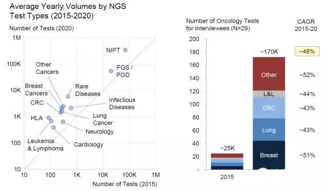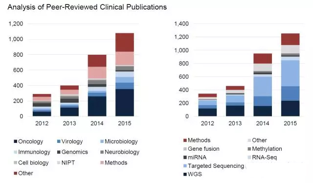 近日,市场研究和战略咨询公司DeciBio的研究者们通过对2012年至2015年间1000多篇论文和30篇专家采访进行了综合分析,结果表明:NGS的临床应用正处于快速增长阶段,目前主要应用在肿瘤、罕见疾病和NIPT领域。在肿瘤领域,NGS主要用于能实施靶向疗法的肿瘤(如乳腺癌、肺癌、结直肠癌)中,帮助优化疾病的诊断与治疗。总体来说,NGS临床应用的发展已超过预期,前景非常乐观。见图1。
