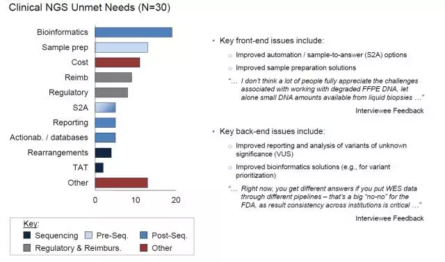 技术挑战 大多数受访专家认为,NGS产业面临的挑战主要集中在上游和下游环节。上游环节包括:提高自动化的样品制备方案。例如,如何从福尔马林固定石蜡包埋(FFPE)的样品以及液态活检样品中获得高质量的DNA。下游环节包括:提高意义不明突变的分析和报告质量,以及生物信息学解决方案。见图6。