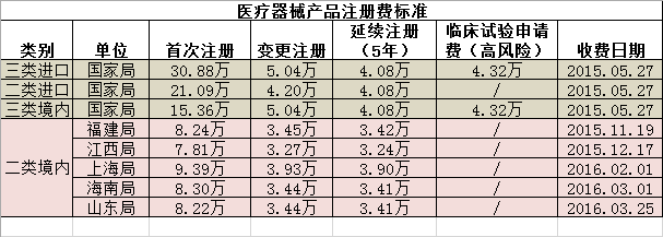 2016年3月25日,根据《山东省物价局 山东省财政厅关于药品、医疗器械产品注册收费标准的复函》(鲁价费函〔2016〕13号),山东省食品药品监督管理局制定了《山东省药品再注册及不改变药品内在质量的补充申请注册收费实施细则》和《山东省第二类医疗器械产品注册收费实施细则》,现予公布,自2016年4月1日起施行。山东省医疗器械产品注册收费如下: