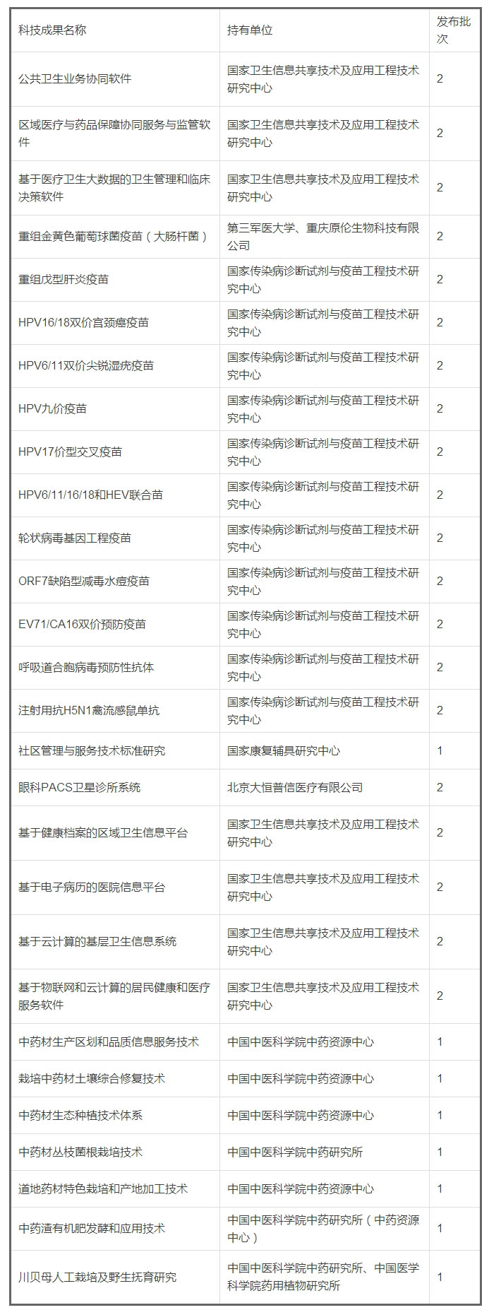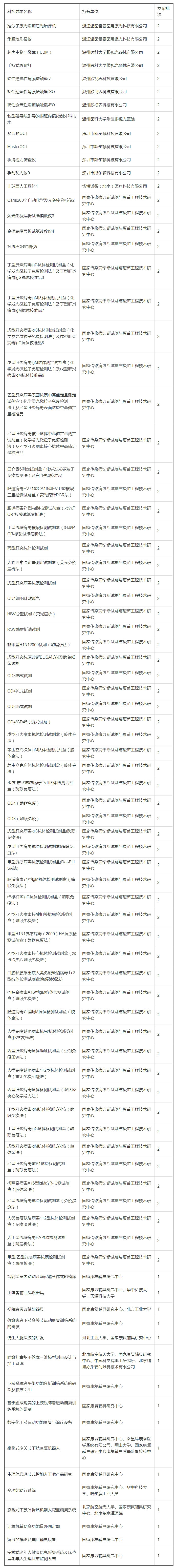 科技部3月24日发布第二批国家科技计划重点科技成果转化推广信息。 此次新发布的科技成果共130项,主要来源于近年来国家“863”、“973”、国家科技支撑计划、国家科技重大专项、科技型中小企业技术创新基金等科技计划的项目成果。 这些成果具有技术优势明显、成熟度较高、示范性较强、市场前景较好等特点。 其中,人口健康领域的科技成果有89项,大部分又是 医疗器械或按照医疗器械管理的体外诊断试剂(69项)。加上3月3日发布的第一批内容,科技部今年已经发布了113项人口健康领域的科技成果转化推广信息,医疗器械占到85项。 两批85项医疗器械名单如下:  其他28项人口健康领域科技成果名单如下: (原标题:85项国家重点医疗器械科技成果名单发布)