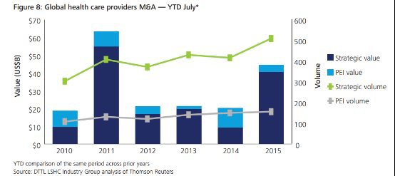 面对市场竞争加剧,加之持续监管压力,美国医疗机构大多采取并购整合医院的形式,提供规模化地大卫生系统和更广泛的服务范围。2014年和2015年中期,医疗机构之间的医疗投资并购增长加剧,如图8所示:美国医疗机构并购占据了2015上半年大部分的并购事件。