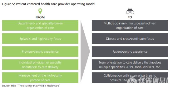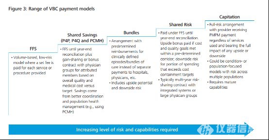追求人口健康 负责健康管理的医疗机构意识到现在更需要提前预知人们的疾病风险,医疗机构和社会保健体系当通力合作,让公共和私营部门共同由疾病治疗转型为医疗预防,从而优化医疗结果。尽管在英国、墨西哥、日本和德国已经显现了好的苗头,但整体来看,预防医疗还处于早期阶段。 价格评级标准的改变 最著名的转变就是美国提倡医疗改革从由按服务项目付费的FFS模式,转向按服务结果付费的VBS方式。现状是一些机构在积极为VBC模式作准备,另一些仍 然保持观望态度。行动缓慢的医疗机构其行为是可以理解的,因为VBS模式的投资巨大,且FFS付款模式利润可观,而且利益相关方对医疗价值判断还未作出明 确合理的硬性规定。所以,当医疗费用和病人数量同步激增,利益相关方需要想方设法采取更低廉的成本来应对。现实是很多障碍正阻挡目标的实现。 VBC模式 医疗卫生系统正在通过优化供应链,加速资金周转,改善服务。比如批量采购、提高记录管理、减少劳动力成本支出、提高临床医疗效率,这些途径都能在短期内提 升利润,但终究不是最本质的解决办法。前瞻性地卫生医疗系统对现有财务业务模型更为看重,会重视每一美元换来的医疗实际价值。 图3反映了VBC付费模式由FFS、共享节约、绑定付费、风险共担到成本平摊等模式的过渡,由低阶向高阶,医疗机构承担的控费责任和支付费用风险也越来越高。 为此,医疗机构为重建VBC模式,需要围绕如下方面进行投入: 1.对医疗表现进行评估:采取报告和分析工具测量结果; 2.病人参与:利用工具提升病人医疗知识和能力,增加治疗依从性; 3.医疗协同:医疗服务方审时度势地适时参与管理,减少成本,提升质量; 4.风险分担:对由临床或病人生活习惯引发的疾病风险进行分级管控; 5.医疗计划:基于循证医学开发新的医疗路径,持续管理疾病。