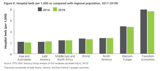 德勤报告还指出对于中国的二三线城市,即便中国政府已经为医院投入大量资金,但医疗基础服务还有待加强。这些城市需要训练有素的医生、擅长疾病诊断的医生以及其 他医疗从业者,让移动医疗技术投资和基础设施投资效益最大化。图6反映了世界范围内,在2014年和2019年每千张床位和当地人口的相对比率。