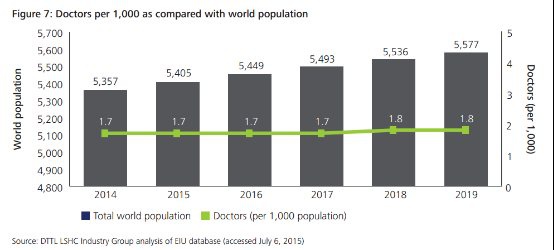 此外,各国在医疗行业方面的改进还包括重组行政功能、信息共享和公开、减少重复的医疗检测服务、大胆采用数字技术,减少对面对面医疗的依赖,提倡居家护理医疗和患者的自我健康管理。 很多国家比如加拿大、英国和澳大利亚等,都有不同的自主性医疗健康机构,从初级到二级医疗、三级医疗、临床培训、领导力发展、质量标准制定、检验、 监管到决策机构,有不同的服务行政部门,分别各司其事。预计,2016年很多医疗健康机构都会努力降低单位成本,实施共享服务。 另外据兰德公司研究,美国31%的医疗费用发生在院内,改善院内医疗协调流程,对降低医疗浪费,促进整个医疗行业发展大有裨益。成本压力、人员配比 模式改变、技术进步和消费者偏好都营造了“无处不在”的新医疗。相应地,众多医疗健康系统都在引进可供选择的多种医疗服务模式,如去中心化地由国家控制下 放到地方管理,从大型医院移植到成本更低的基础设施应用。 据统计,平均来看,从2014年到2017年,每1000名医生和全世界人口的比例基本保持不变,印度是最短缺医生的,医生和人口比例为 0.6:1,而中国同样不容乐观。医院多点执业还未放开,这阻止了民营医院的发展。虽然在部分地区有多点执业的试点项目,但大众还是在意公立医院的排名和 品牌影响力,民营医院和外资医院在招收高信誉度的医生方面困难较大。