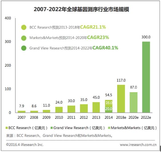 2015年初美国奥巴马政府颁布“精准医疗计划”,今年3月科技部也将精准医疗列入重点研发计划,精准医疗受到中美两国政府的高度重视。政策层面对于精准医疗的鼓励,也推高了产业层面的热度,而作为精准医疗排头兵的基因测序也获得了学术、资本和产业等多方关注。在精准医疗风头正劲的背景下,艾瑞即将发布《全球基因测序行业投研报告》,报告中梳理了全球基因测序行业发展情况、发展趋势和投资热点。本文截取报告中的一部分,对基因测序市场规模和投资热点进行分析。 全球基因测序市场空间广阔,市场规模将超110亿美元 艾瑞整理公开数据显示,全球基因测序市场规模呈逐年增长的趋势,2007年全球基因测序市场规模为7.9亿美元,到2014年市场规模为54.5亿美元,预计2018年全球基因测序市场规模将超过110亿美元,年复合增长率为21.1%。 艾瑞分析认为,基因测序服务和上游基因测序耗材和试剂是带动市场规模增长的主要因素。随着基因测序技术的成熟,基因测序成本呈逐年下降趋势,测序成本的下降,将提高基因测序服务的渗透率,进而推动市场发展。基因测序需求增长的同时,也增加了对基因测序耗材和试剂的需求,因此在基因测序服务增长的同时,也带动了测序耗材和试剂的增长。