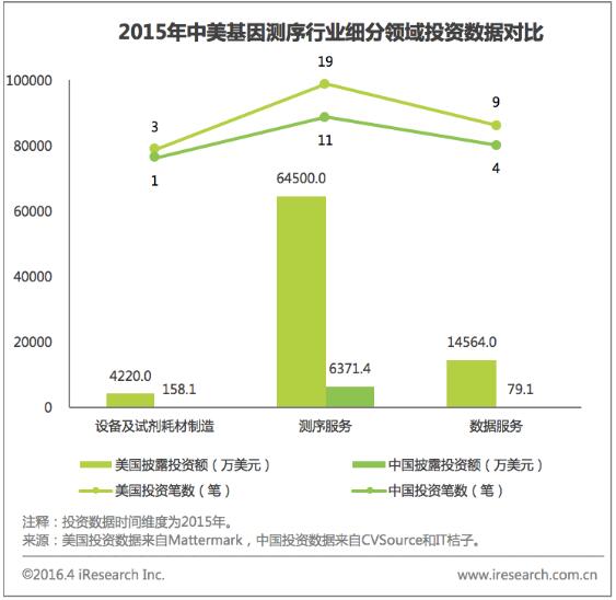 基因测序服务均受中美两国资本青睐,但投资量上差距大 艾瑞整理公开资料显示,2015年中国基因测序行业上游设备及试剂耗材制造环节仅获得1笔投资,披露投资金额为158.1万美元,同美国相比,投资笔数差2笔,披露金额差4061.9万美元;中游测序服务环节共获得11笔投资,披露投资金额为6371.4万美元,投资笔数较美国差8笔,披露投资金额较美国差5812.6万美元;中游数据服务环节获得4笔投资,披露投资金额为79.1万美元,投资笔数较美国少5笔,披露金额较美国少14484.9万美元。从投资笔数占比数据来看,测序服务环节所获投资最多。可见,基因测序服务在中美两国均受到资本市场的青睐,但在披露投资金额上还有非常大的差距。