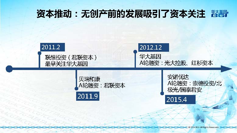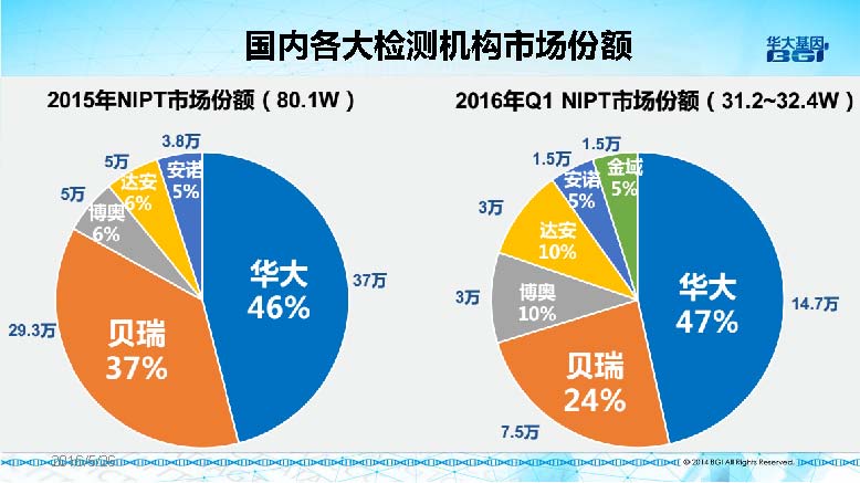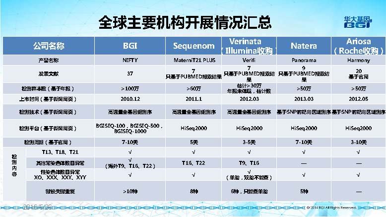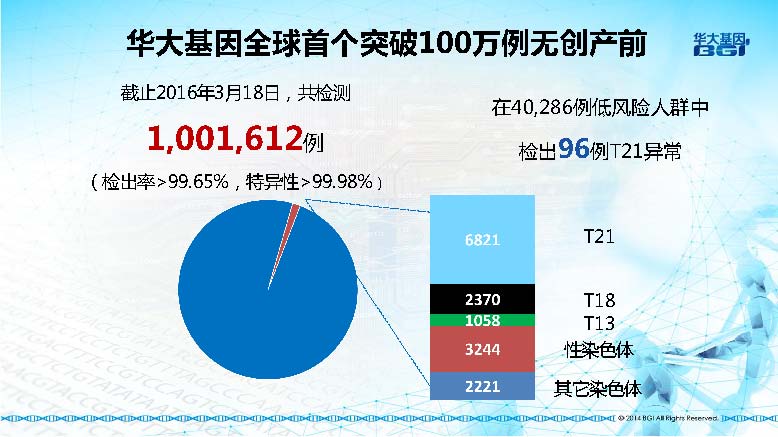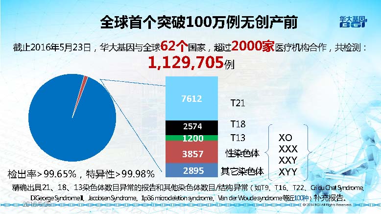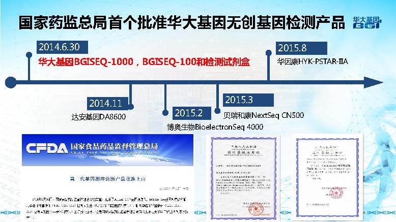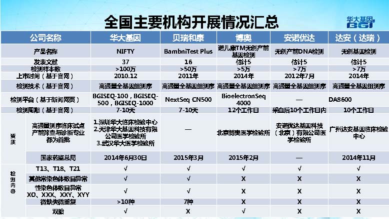 国家食药总局在2014年6月30日第一个批复了华大基因的无创产前基因检测产品,包括两款华大基因申报的测序仪BGISEQ-1000,BGISEQ-100,随后,2014年11月份,达安基因;2015年2月份博奥生物;2015年3月份贝瑞和康;2015年8月份华因康都获得了类似的高通量测序的产品。与此同时,国家卫计委也批复了高通量测序应用的临床应用试点单位,其中医政管理局批准了8家,分别是武汉华大、深圳华大、天津华大、北京博奥生物、北京爱普易、北京安诺优达、广州达安基因和湖南的湘雅医学检验所。与此同时,妇社司又批准了108家的产前诊断机构作为首批的高通量测序的临床应用试点单位。与此同时也明确了这项检测技术的适用时间、适用人群。 君联资本最早开始关注这项检测技术,由于当时华大基因并不缺少投资,随后君联资本投资了贝瑞和康。一直到2012年底,由于华大基因要收购美国测序技术公司Complete Genomics所以开始了首轮的融资。 华大基因NIFTY是全球首个也是目前唯一一个服务突破100万例用户的无创产前基因检测机构,截至今年5月23日,华大基因已与62个国家近3000家的医疗机构合作,共检测了112万例的样本。其中检测出了21—3体7000多例,18—3体2500多例,13—3体1200多例,除此之外,还有性染色体和其他染色体的异常,从国内主要机构开展无创产前基因检测的汇总,可以明确地发现,无论是发表文献、检测数据量还是资质方面以及检测的内容,华大基因NIFTY?都处于明显的优势。