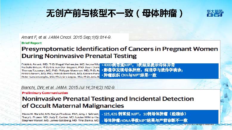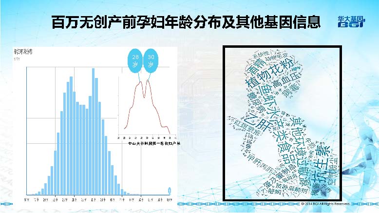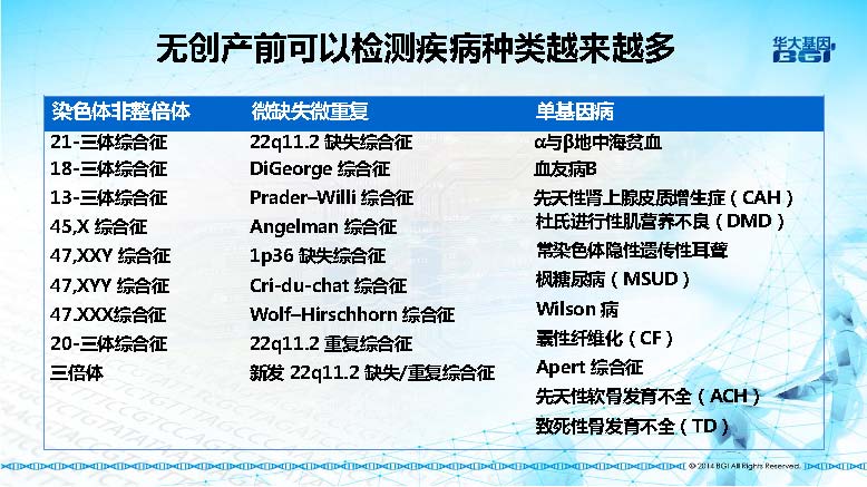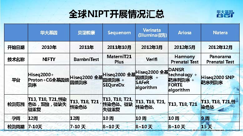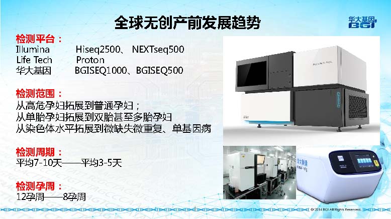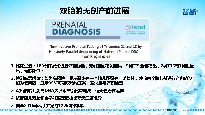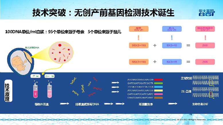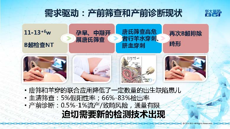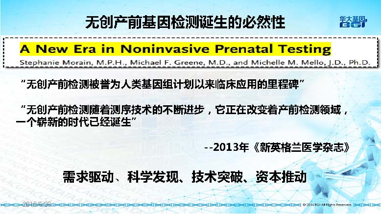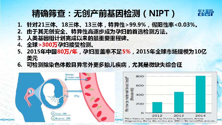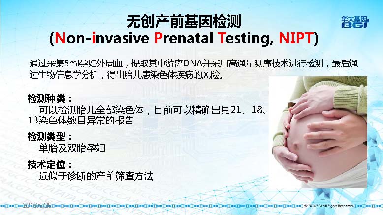大家好,我是华大基因股份公司的首席市场官赵立见,很高兴能有机会和大家一起分享一下无创产前基因检测技术的过去、现在和未来。 什么是无创产前基因检测 无创产前基因检测技术全球统称为NIPT(Noninvasive prenatal test),主要是通过采集5毫升的孕妇外周血,从血浆中把游离的DNA提取出来,经过高通量的测序和生物信息学的分析,得出胎儿患染色体异常的疾病风险率的一项技术。这项检测技术可以检测胎儿全部的染色体。目前,国内可以精确地出具21、18、13染色体数目异常的报告。大部分专家将无创产前基因检测技术定位为一种近似于诊断的产前筛查方法。 华大基因的无创产前基因检测叫NIFTY,2010年华大基因注册NIFTY?商标并在全球接收第一例临床样本。目前,NIFTY?可以针对单胎和双胎,包括试管婴儿检测胎儿全部染色体(含常、性染色体数目、大片段结构异常),可以精确出具21、18、13染色体数目异常的报告(根据相关法规规定),其他如发现异常,免费出具补充报告。 无创产前基因检测技术的出现存在着一定的必然性,大家一直把无创产前技术誉为人类基因组计划以来临床应用的里程碑技术,也认为这项技术的出现一定会改变整个产前筛查和诊断的领域,无创产前基因检测是多重因素联合推动的结果,它依赖于需求的驱动、科学发现、技术突破和资本的推动。