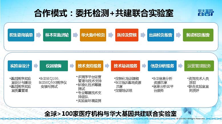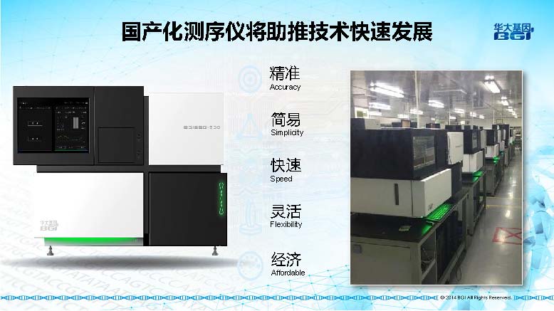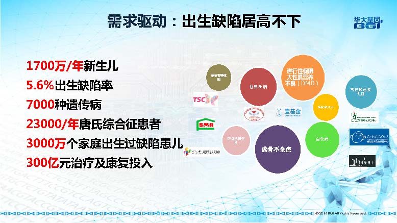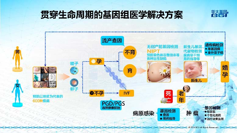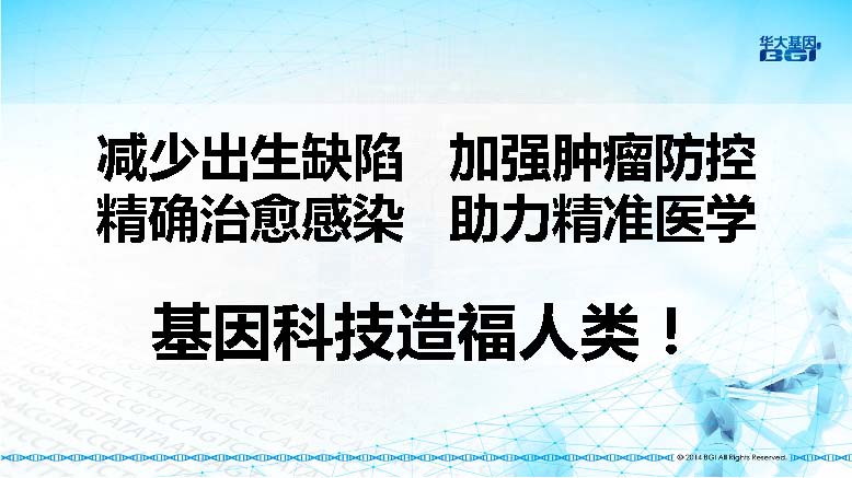 与此同时,华大基因NIFTY也针对双胎开展了无创产前的研究,经过前期的临床试验,截至到目前一共完成了超过18000例的双胎的标本检测。与此同时,基于微缺失微重复、试管婴儿的无创产前检测早已经在华大进行了应用。所以目前除了能够精确出具21、18、13染色体数目异常的报告之外,其他染色体的数目异常或者是结构异常都会发送补充报告。与此同时,华大基因NIFTY在针对单基因病的无创产前基因检测方面也取得了一系列的进展,目前可以针对多种单基因遗传病进行无创产前基因检测,包括地贫、耳聋、DMD等等,NIFTY可以检测的疾病种类也会越来越多。目前已经有文献报道的,可以通过无创产前检测到的各类的染色体、微缺失、微重复和单基因病。无创产前基因检测技术并不是完美无缺,存在一定的假阳性和假阴性,尤其是孕妇怀孕期间存在肿瘤,都会对这项检测技术的信息判断造成影响和干扰,都有了案例和文章发表去证实。 最后,随着国产化测序仪的陆续推出,未来这项检测技术还会得到进一步地提升,检测的结果会更加精准,操作会更加简便,检测周期会更加快速。那么检测的通量也会灵活多样,最重要的是检测成本会出现大幅度下降。 未来的合作模式也会从目前主要的委托检测变成与医疗机构共建联合实验室。截至目前,华大在全球已经与超过100多家医疗机构共建了联合实验室。华大基因会提供贯穿整个生命周期的基因组学解决方案,从婚姻前遗传病的筛查到怀孕期间无创产前基因检测,到新生儿代谢病的筛查、遗传性耳聋基因筛查,以及到老年病、肿瘤以及感染性疾病的筛查等等。目标是减少出生缺陷,加强肿瘤防控,精确治愈感染,助力精准医学,最终实现基因科技造福人类。 Q&A 群友:请问,华大自主研发的测序仪有哪些优势? 赵立见:华大自主研发的BGISEQ-500是一种桌面式的测序仪,未来一定会在操作方面更加简便,我们设置了一体化的操作程序。检测的通量也会大幅度提升,并且会更为灵活,拿NIFTY?来说,BGISEQ-500可以一次性地检测96个到192个样本,可以灵活地设置。未来检测的成本也会出现大幅度地下降。 群友:无创产前基因检测何时放开,何时纳入医保,何时会普及?伴随二胎政策的放开,预计今年是否迎来快速发展? 赵立见:深圳在2013年将无创产前检测纳入了生育保险,随后多个省份都将无创产前检测列入了生育保险的报销范围,我相信随着这些检测技术成本的逐步下降,未来纳入医保的可能性会越来越大。 群友:出生缺陷三级预防中,一级预防即孕前的检测最早,也很重要。还有,孕前检测可能由于涉及的疾病多,存在大量漏检,华大是怎么解决这方面的问题的? 赵立见:目前华大基因的孕前筛查已经从常见的12种疾病变为了常见的600种疾病,主要是包括了发病率较高、致死、致残率较高的疾病作为一个普查技术。基于单基因病的无创产前目前仍处于科研阶段,随着样本的积累,我们相信在未来的两到三年之内一定会能够快速地应用到临床。 群友:孕前和产前的基因检测,出现问题,可以进行有效的干预。新生儿基因检测,更多的时候,知道结果也没有用,只是提前判了孩子死刑,这在未来是否会可能改变,赵老师怎么看? 赵立见:新生儿阶段的基因检测或者是遗传代谢病的筛查非常有其存在的必要性,尤其是在这个阶段很多疾病是可以干预的,比如新生儿的药物性耳聋、苯丙酮尿症、一些常见的遗传代谢病等等都可以在早期进行干预并且效果非常好。未来随着基因编辑技术,还有一些免疫细胞和干细胞治疗技术的出现,相信为在这个领域,新生儿的检测技术也会有越来越多的发展空间。 附PPT全文