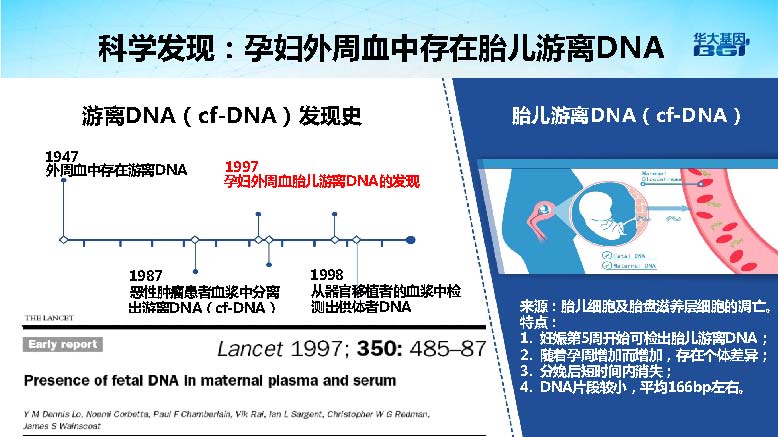 首先在需求驱动方面,我国的出生缺陷率居高不下,每年有1700万的新生儿,5.6%的出生缺陷率,接近7000种的遗传病,每年有23000个唐氏综合征患儿出生,这都导至了我国的出生缺陷率一直处于一个非常高的水平。 为了应对如此高的出生缺陷率,我国使用了接近十几年的产前筛查和诊断的系统,最早的时候通过在11、13孕周的时候进行B超筛查,随后开展孕早期和孕中期的唐氏筛查,对于唐氏筛查高风险的孕妇则要进行羊水穿刺和产前诊断,随后进行B超的排查,这套体系的出现为降低一定数量的出生缺陷起到了作用。但是也存在一定的弊端,就是血清学筛查大概的检出率是66%到83%,并且同时伴随5%以上的假阳性率,而且有创伤性的产前诊断会带来一定的流产、甚至是窒息的风险,所以迫切需要新的技术出现。 1947年,两位法国科学家发现了外周血内存在游离DNA,随后又有科学家在恶性肿瘤患者体内发现了游离DNA的存在,一直到1997年香港中文大学的Dennis Lo证实了孕妇的外周血内存在胎儿的游离DNA,从而奠定了无创产前基因检测技术的理论基础。 胎儿游离DNA来源于胎儿细胞以及胎盘的滋养层细胞的凋亡,一般认为从妊娠第5周开始可以检测出胎儿游离DNA,它会随着孕周的增加而增加,存在个体上的差异,但游离DNA的片断较小,一般认为平均在166BP,而且分娩后短时间内消失。