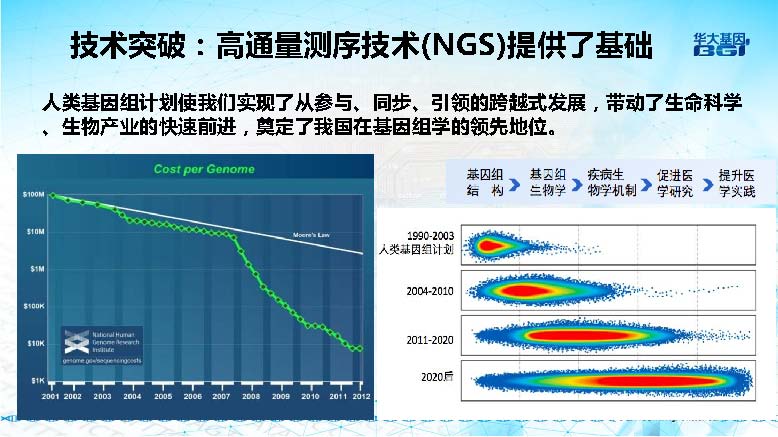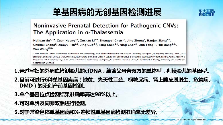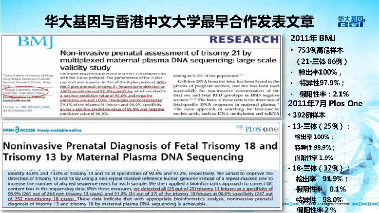 人类基因组计划使我们在基因组学研究里面实现了从参与同步到引领的跨越式的发展,尤其是奠定了我国在基因组学领先的地位,随着近几年高通量测序技术的出现也为基因组学的研究提供了更好的基础。同时这项技术也从基本的基因组结构研究热点开始转向到提升医学实践。基于高通量测序的无创产前基因检测技术就应运而生。 无创产前基因检测技术(注册商标为NIFTY) 华大基因最早参与了无创产前基因检测技术的开发,我们是在2006年建立了高通量测序平台,2008年建立了无创产前基因检测的方法学,在2009年到2010年完成了3177例的临床试验。在2010年12月份全球最早开展临床使用。华大基因与香港中文大学开展合作后最早发表的文章,分别是在2011年的1月份和2011年的7月份,针对700多例的高风险孕妇检测出了86例的21—三体,对于392例的高风险孕妇检测出了25例13—三体和37例18—三体,所有的检出率和特异性都已经接近诊断水平。2011年至今,华大基因在这个领域累计发表了37篇文章,涉及到方法学、多中心的临床研究、特殊案例、双胎的无创检测、试管婴儿的无创检测、无创的微缺失微重复、无创全基因组等等,在科学研究领域始终保持了全球领先。