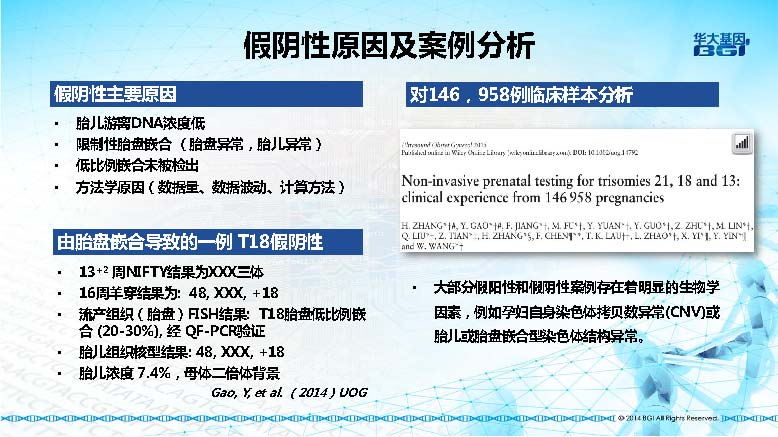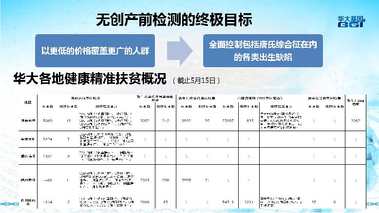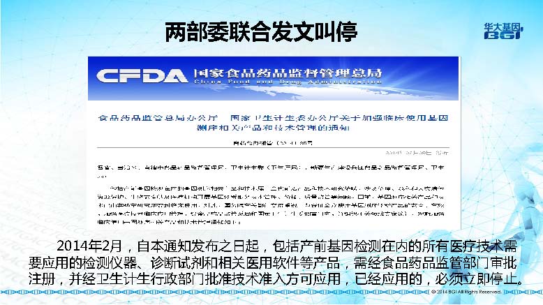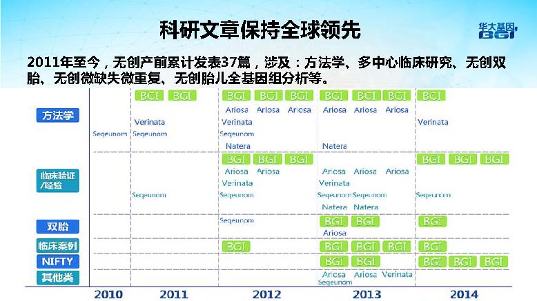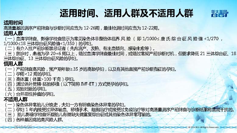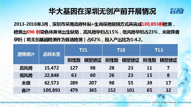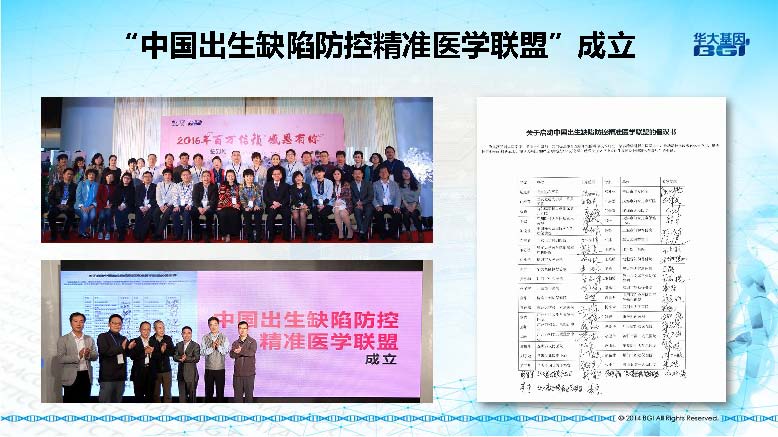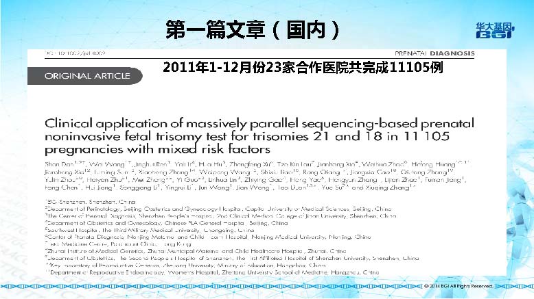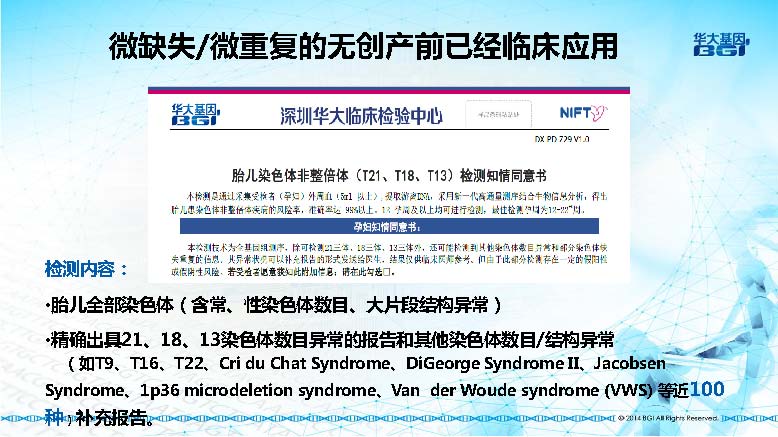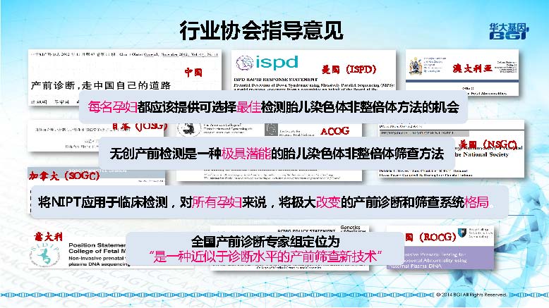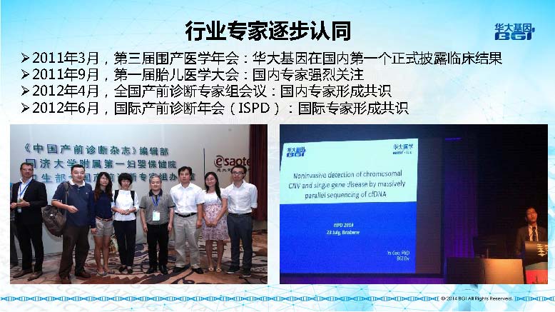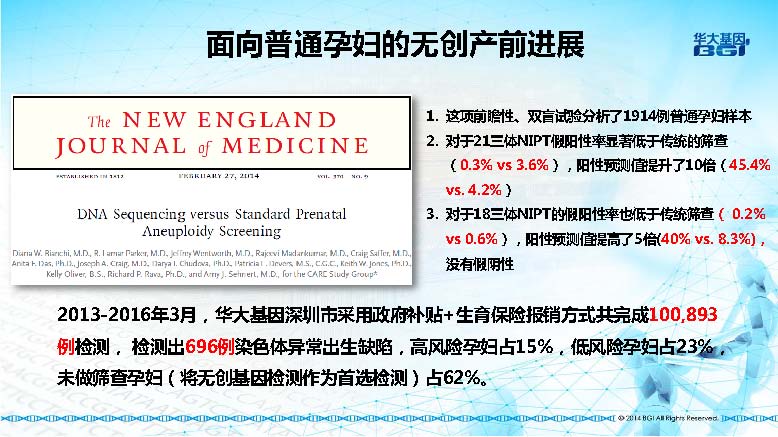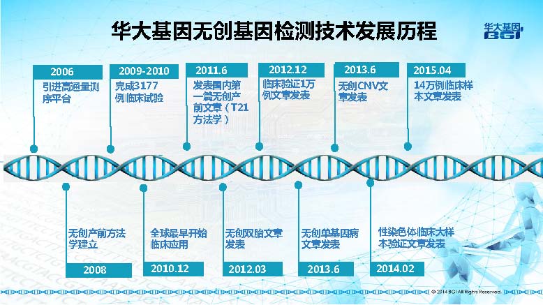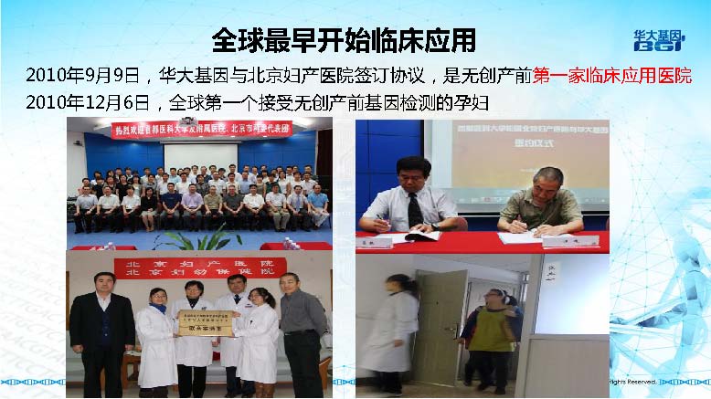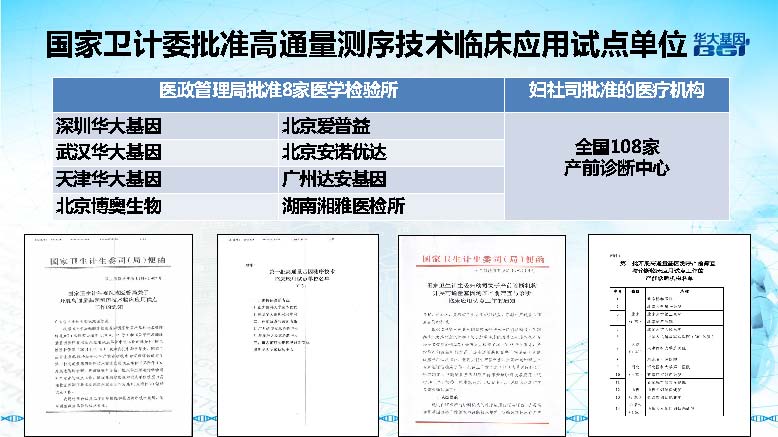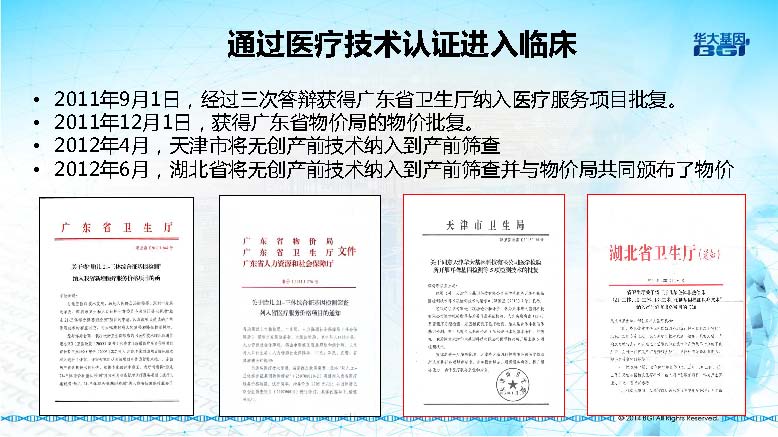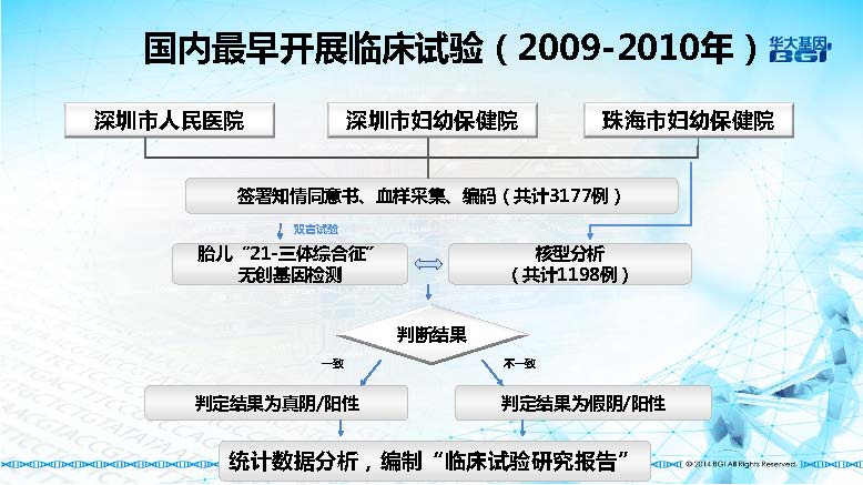 2009年-2011年我们在深圳市人民医院、深圳市妇幼保健院和珠海市妇幼保健院共完成了3177例的临床标本的实验。最后结果显示,这项检测技术的准确率能够达到99%以上,所以我们认为这项检测技术可以逐步地应用到临床实践。 2010年9月9日,华大基因与北京妇产医院签定协议,成为全球第一个将无创产前基因检测技术进行临床应用的医院。在同年12月6日也有了全球第一个接受无创产前基因检测的孕妇。 无创产前基因检测技术也得到了行业专家逐步的认同,2011年的3月份在第三届围产医学会上,华大基因NIFTY?在国内第一个正式公开临床结果,在2011年9月份,第一届胎儿医学大会上,国内专家开始强烈关注无创产前基因检测技术,一直到2012年的4月份,国内的产前诊断专家组会议形成共识。2012年6月份,国际产前诊断的年会全球专家形成共识。行业协会也发表了相关的指导意见,我国的产前诊断专家组把这项检测技术定位成近似于诊断水平的产前筛查新技术。 随后美国的ACOG协会、ISPD等等都对这项检测技术给予了极高评价。 华大基因NIFTY是通过医疗技术的论证进入临床的。在2011年的9月1日,获得广东省卫生厅的批复,随后在2012年4月份获得天津市的批复,2016年的6月份获得湖北省的批复,同时也将该项检测技术的物价进行了颁布。随后无创产前基因检测技术迎来了快速地发展期,但是基因检测机构参差不齐,所以在2014年2月份,国家卫计委和国家食药总局联合发文,叫停了无创产前基因检测技术。