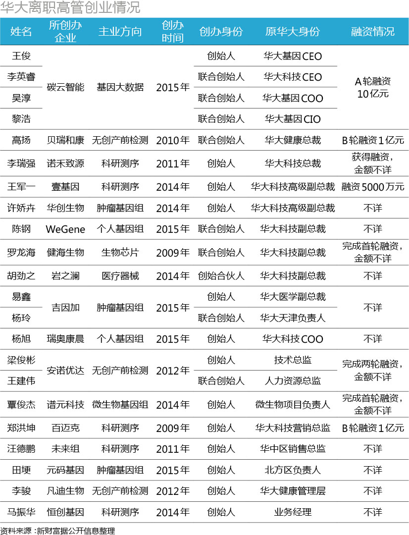 “华十六年,俊王出走,睿王同行,烨宗上位……” 这据称是某位华大内部员工在匿名社交平台“无秘”里写的一篇文言文的开头,描述的是2015年下半年(华大创办第16年)华大所发生的有史以来最大的一场人事地震。 就在华大基因递交IPO申请材料的前夕,华大基因CEO王俊(俊王)、华大科技CEO李英睿(睿王)、华大基因COO吴淳、华大基因CIO黎浩等核心高管层的四位成员,几乎在同一时间从华大离职,王俊离开之后的职务空缺由尹烨(烨宗)接替。 对于这场蹊跷的人事变局,外界甚感惊诧,并引发了关于汪建与王俊的“宫斗”猜测…… 离职之后的王俊,随即加入到了基因创业大军中,并迅速成为一颗创客新星。 基因界的华小与华创 2015年10月,深圳碳云智能科技有限公司(下称“碳云智能”)宣告成立,创办人正是王俊领衔的前述华大离职四高管。 出走的王俊,仅仅是华大离职创业者的其中之一。在中国的基因组学应用行业,华大基因是名副其实的“黄埔军校”。过去数年来,华大的管理层、销售骨干、实验室骨干,如星星之火般向外播撒,几成燎原之势。整个行业的中坚力量,几乎都与华大有着或近或远的渊源。 在这个行业里,几乎所有稍具知名度与影响力的企业,皆由华大离职者创办。由于华大离职创业的人为数众多,这个群体被外界冠名以华小及华创。 新财富根据公开资料整理了一份华大离职高管创业名录,这份不完全名单涉及20余人、近20家企业(附表)。