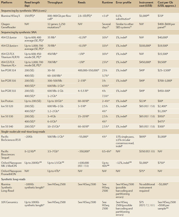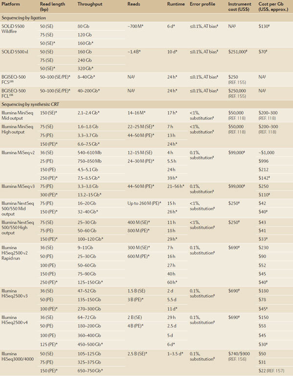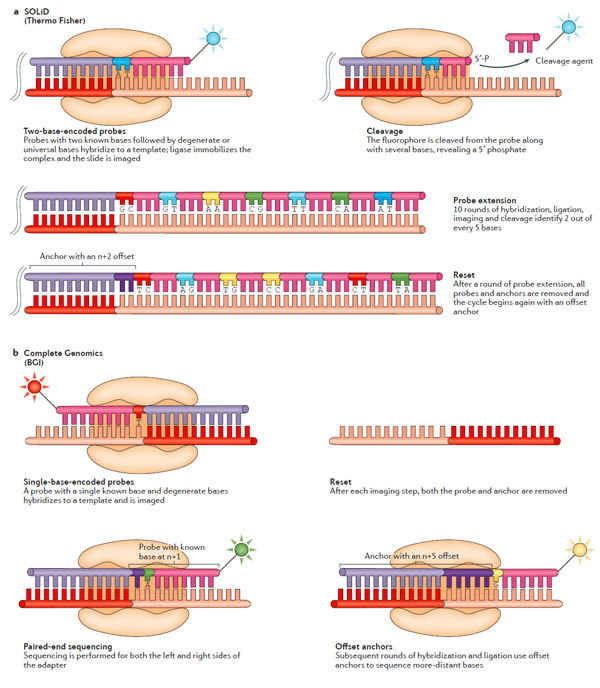 随 着人类基因组计划(human genome project )在2003年顺利完成,基因组测序技术取得了长足的进步,这直接导至了每兆基因组成本的大幅下降以及检测的基因组数量越来越多。人们对基因组的复杂性深 感震惊,这也引导着测序技术的进一步发展。最近的一些突破性技术使得测序技术在更短的时间内可以获得更多的数据量。与之对应的是,还有一些技术的进步使得 单条序列的测序读长变得更长——这对解析结构性的复合区段是极其必要的。这些进展给科研人员以及医疗诊断人员提供了一个绝佳的平台使得人们对基因组变异导 致的表型变化以及疾病发生有了进一步的了解。 近日,美国冷泉港实验室联合加州大学戴维斯分校的研究人员在国际著名评论型综述杂志Nature Reviews Genetics(影响因子41)上发表了一篇评论型综述。该综述对高通量测序的技术原理以及各平台的优势比较和实践应用进行了深入浅出的分析。 介绍 自 从DNA的双螺旋结构被人们解析开始1,人们在探究健康与疾病的基因组的复杂性与差异性上做出了巨大的努力。为了支持人类基因组计划的顺利进行2,人们在 仪器和试剂上做出了巨大的改进。该计划的完成使得人们强烈的意识到人们需要更多更好的技术与数据分析能力来回答随之而来的一系列生物学问题。然而,通量的 限制以及居高不下的测序成本成为了人们进一步了解基因组的一道坎。2000年之后推出的高通量测序平台很好地解决了这个问题,人类基因组测序的成本直接因 此下降50000倍,并且由此产生了一个新的名词:下一代测序(next-generation sequencing,NGS)3。在过去的十年中,NGS技术不停的在进步——测序的数据量增加了100-1000倍4。这些技术上的进展使得人们甚至 可以在一条read上读出整条基因组序列。根据Veritas Genomics的数据5,人类基因组测序的成本也已经下降到1000美元/人。不仅如此,该技术已经广泛在临床诊断上得到应用3,6。 但 是,尽管NGS技术非常重要,却并非完美。与NGS技术一道出现的是该技术带来的一系列问题。NGS可以提供海量的数据量,但是其质量却有待提高(有报 道,NGS在序列拼接过程中,错误率在0.1-15%范围内),并且NGS的序列读长普遍较低(每条read的长度在35-700bp之内7,这比普通的 Sanger测序要短),这意味着需要更严格复杂的序列拼接。尽管长读长测序可以克服NGS的这一大弱点,但相对而言,成本较高并且通量较低,这也限制了 该技术的进一步应用。最后,NGS同时还和其他的技术之间存在着竞争的关系。 短读长(read)的NGS测序 测序模版克隆法生成综述 短 读长测序方法包含两种:边连接边测序(sequencing by ligation, SBL)以及边合成边测序(sequencing by synthesis, SBS)。在SBL方法中,带有荧光基团的探针与DNA片段杂交并且与临近的寡核糖核酸连接从而得以成像。人们通过荧光基团的发射波长来判断碱基或者其互 补碱基的序列。SBS方法通常使用聚合酶,而且,诸如荧光基团在链的延伸过程中被插入其中。绝大多数的SBL和SBS方法,DNA都是在一个固体的表面上 被克隆。一个特定区域内成千上万个拷贝的DNA分子可以增加信号和背景信号的区分度。大量的平行同样对上百万的reads的读取大有帮助,每个平行只有唯 一的DNA模板。一个测序平台可以同时从上百万的类似反应中读取数据,因此可以同时对上百万的DNA分子进行测序。 产生模板的克隆有几个方 法:基于磁珠(bead-based),固相介质(solid-state)以及DNA微球技术(DNA nanoball)(图1)。DNA模板产生的第一步就是样本DNA的片段化,接着是连接到一个为了克隆和测序而设计的接头上。在磁珠法的准备过程中,一 个接头和寡核糖核酸片段互补并且固定在珠子上(图1a)。DNA模板通过使用油包水PCR(emulsion PCR,emPCR)8得以扩增。单个珠子上被克隆得到的DNA片段可以达到上百万个9。这些珠子可以被分为glass surface10或者PicoTiterPlate(罗氏诊断)11。固相介质扩增12避免了油包水PCR,取而代之的是在固相介质上直接进行 PCR13(图1b,c)。该方法中,正向和反向引物结合在芯片的表面,这些引物给单链DNA(single-stranded DNA,ssDNA)提供了末端的互补序列供其结合。最近,几个NGS的平台都是用了模块化的flow cells。 BGI使用的 Complete Genomics technology测序技术是唯一一个在溶液中完成模板富集的技术。在这种情况下,DNA被多次连接,成环以及剪切从而为了产生一个包含4个不同接头的 环状的模板。通过旋转环状扩增(rolling circle amplification,RCA),可以最多产生超过200亿的DNA微球(图1d)。微球混合物随后被分配到芯片表面上,使得每个微球可以占据芯片 的一个位点14。 图1:模板扩增策略。 边连接边测序(SOLiD和Complete Genomics) 从 根本上来说,SBL法包含了杂交和对标记的探针的连接15。探针包含了一到两个特定碱基序列和一系列通用序列,这可以使得探针与模板之间进行互补配对。锚 定的片段则包含一段已知的和接头互补的序列用于提供连接位点。连接之后,模板被系统进行测序反应16。在锚和探针复合物或者荧光基团被完全移除之后,也或 者连接位点重新生成之后,新的循环又重新开始了。 SOLiD平台使用的是双碱基编码的探针,每个荧光基团信号代表了一个二核糖核酸17。因 此,原始输出的数据并非直接和已知的核糖核酸相连。因为有16种可能的二核糖核酸组合并不能单独结合荧光基团。每四种组合使用一种荧光信号,共有四种荧光 信号。所以,每种连接信号代