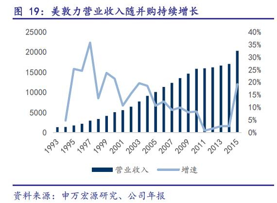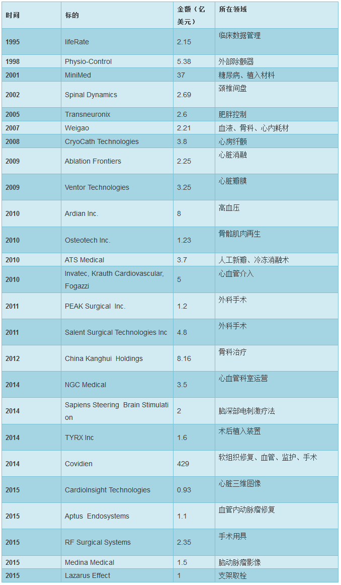 ![]() 罗氏、美敦力等国际医疗器械巨头均通过规模化并购发展壮大。 我们以美敦力为例。自1993 年起,美敦力不断进行并购活动,除了我们列出的金额上亿美元的大型并购外,美敦力也进行了大量小型并购活动。目前美敦力已经形成了糖尿病产品、消化道疾病产品、泌尿系统产品、神经系统疾病产品、骨科疾病产品、心血管疾病产品、植入耗材、人工心脏、疼痛产品等多品类产品管线。 过去21年,美敦力大型并购案一览 ![]() 随着并购的进行,美敦力营业收入持续增长,2015年营业额仅次于强生医疗,成为全球医疗器械巨头。其二级市场股票价格的表现也非常优秀,远远跑赢标普500 指数。 ![]() ![]() 从美敦力,再看国内械企并购 从国内医疗器械的并购案例看,2012 年以来的并购案例大幅增加。2014 年器械相关的并购案例超过40 例,并购金额超过1100 亿,从同类产品并购、产业链并购到平台化收购,国内器械行业的整合大潮已经到来,新的龙头企业将不断产生。 我们认为,医疗器械未来之星:IVD、高值耗材、独立影像中心、肿瘤治疗中心、医疗机器人、家用医疗器械等领域潜力巨大。 随着国内人口结构的老龄化,国家医疗政策深化改革,医疗器械行业开始进入一个高速发展期。我们经过研究,挑选出IVD(含POCT)、医疗影像中心、家用器械、医疗机器人、肿瘤治疗中心、高值耗材6 个可能成为未来之星的热点板块。 备注:本文节选自申万宏源研究报告《恰风华正茂、龙头初现:科技与医疗的交融、创新与整合的先锋 ——医疗器械行业深度报告》,报告作者:杜舟 研究支持:孙辰阳。 来源:申万宏源研究报告 |