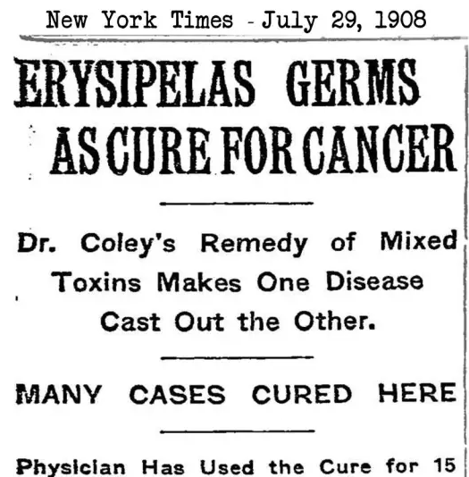 1908年《纽约时报》对Coley混合毒神奇疗效的报道 Coley混合毒的神奇疗效很快便不胫而走。1899年,一家名为Parke-Davis的公司也开始生产这种毒素,而且一下就做了三十年。那时,横跨欧美的多家医院(包括梅奥诊所在内)都在使用它,尽管疗效并不稳定。 式微 在进入20世纪后,放疗进入了人们的视野。相比之下,这一种抗癌疗法的效果更为稳定和可预测。于是,肿瘤医生们便逐渐不再使用Coley混合毒了。到了1915年,Coley医生所在的纪念斯隆•凯特琳癌症中心甚至明确要求,对所有前来就医的癌症患者必须采取放疗,不得使用Coley混合毒。后者尽管仍在其他一些医院在被使用,但大都逐渐被取代。就这样,随着Coley混合毒的逐渐淡出,Coley医生也黯然退场,他于1936年去世。 二战后,化疗成为了抗癌疗法的重要组成部分,而这成为了对Coley混合毒的致命一击。1965年,美国癌症协会甚至将它列入“未批准”疗法的黑名单,尽管后来又将其从中移除。 传承