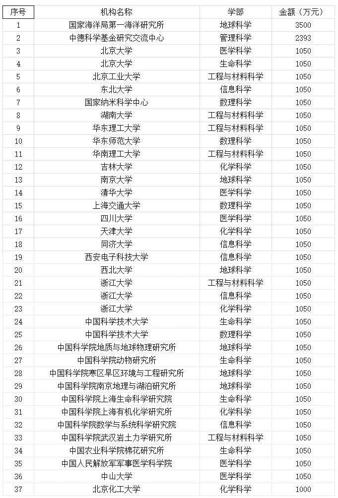 本年度自然科学基金项目单项资助最多的数额是3500万元,该项目研究方向为地球科学,被国家海洋局第一海洋研究所揽。另外,单项资助1000万元以上的项目37项,总金额42593万元,详情见表2。